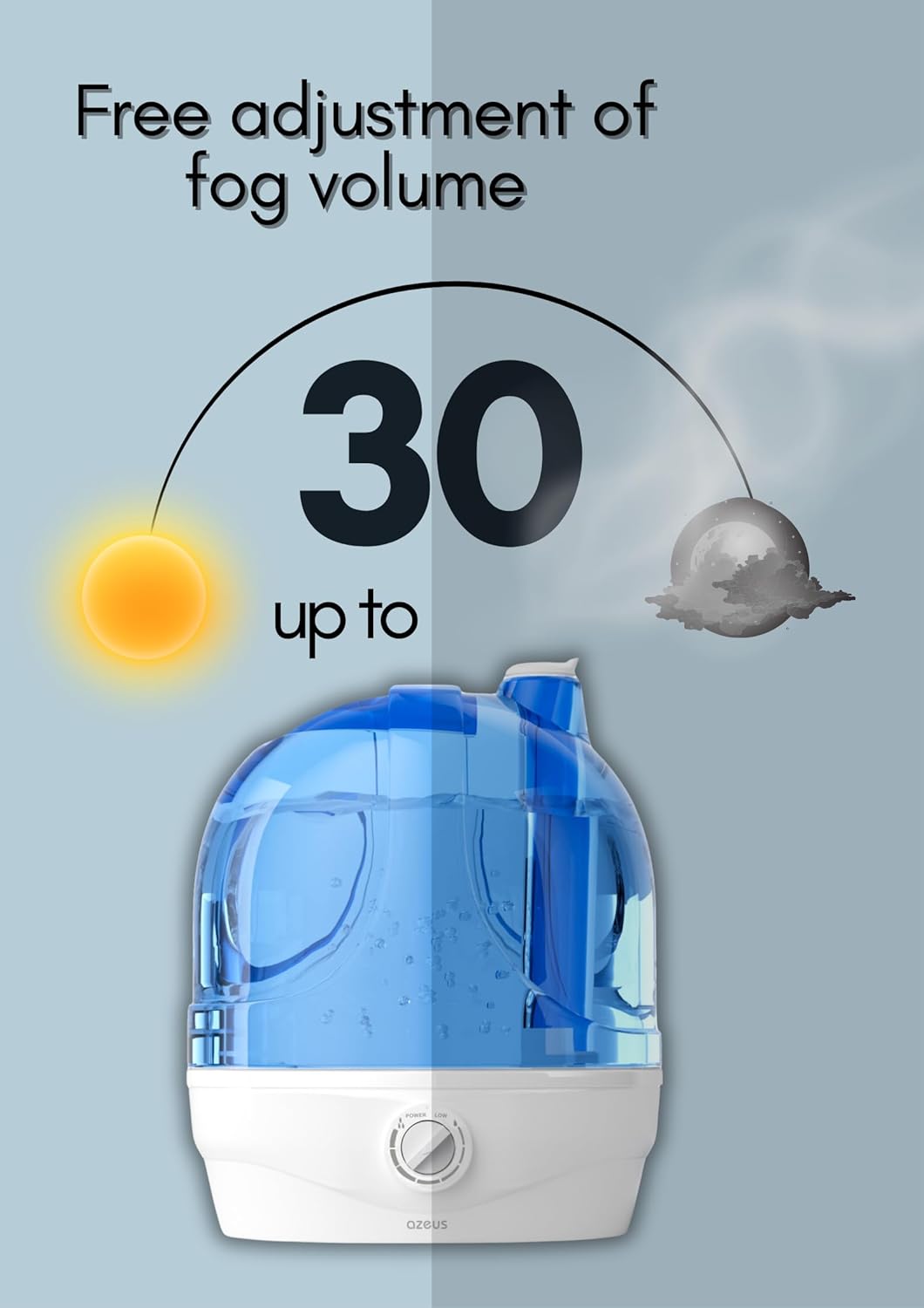 ✓ LARGE CAPACITY HUMIDIFIERS WITH AUTO SHUT OFF – AZEUS Air Humidifier for bedroom holds an impressive 2.8L (0.74 gallon) tank. In addition to remarkable capabilities, the pinnacle of operating time is achieved: 10-30 hours of continuous use in minimum and maximum mist mode. This mighty capability definitely reduces an adding water issue when it runs out: the light of the air humidifier turns red and shuts-off automatically. Do not worry in case you forgot to turn the power off when you are out.