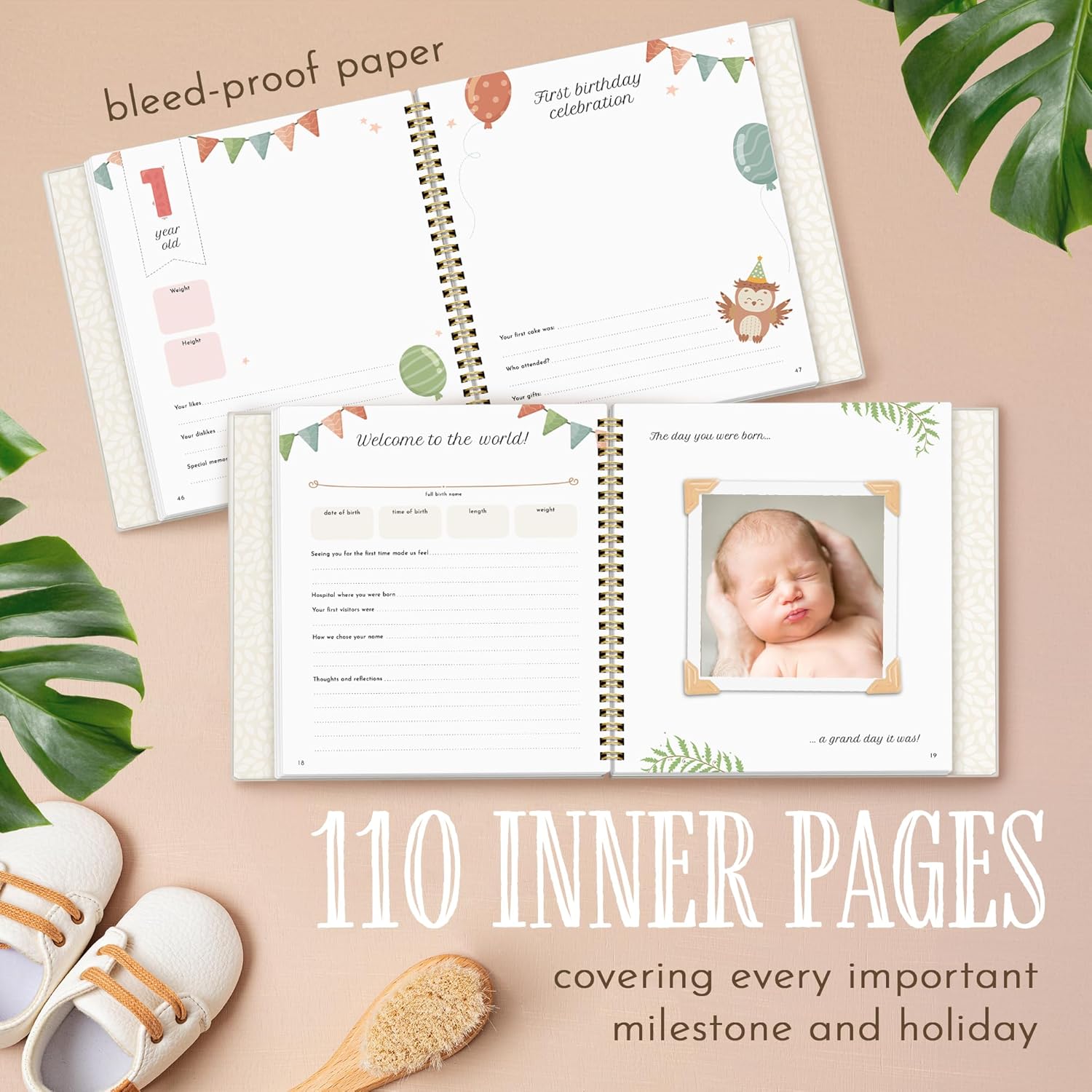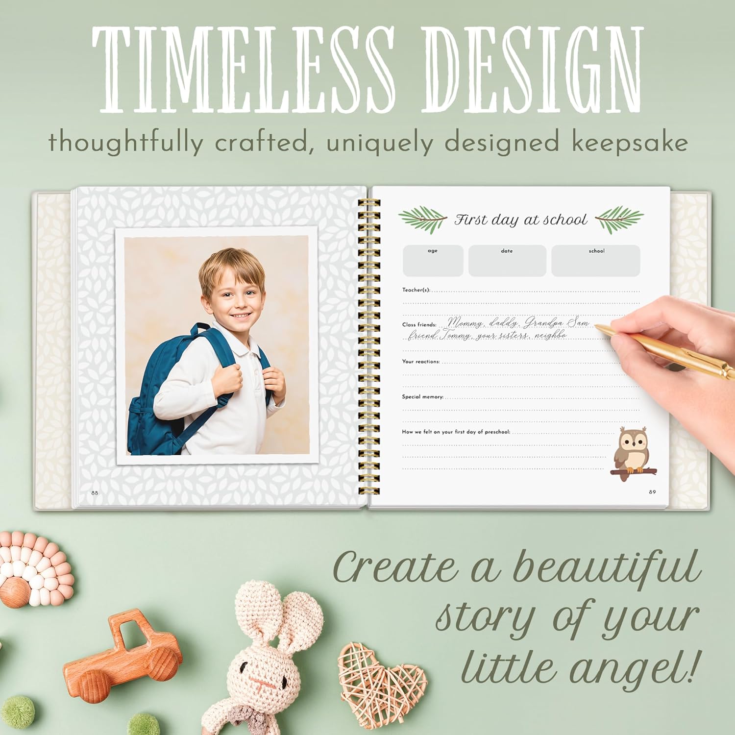 110 Full-Color Inner Pages: Inside the book, you’ll find 110 fullvcolor pages (8.46″ x 9.25″) designed to capture every important moment in your baby’s firsts five years. From the first ultrasound to the first steps, this memory book includes spaces for milestones, photos, and details that will help you relive those magical moments for years to come. Each page features ample space for writing and decorating, ensuring that no memory is left behind.