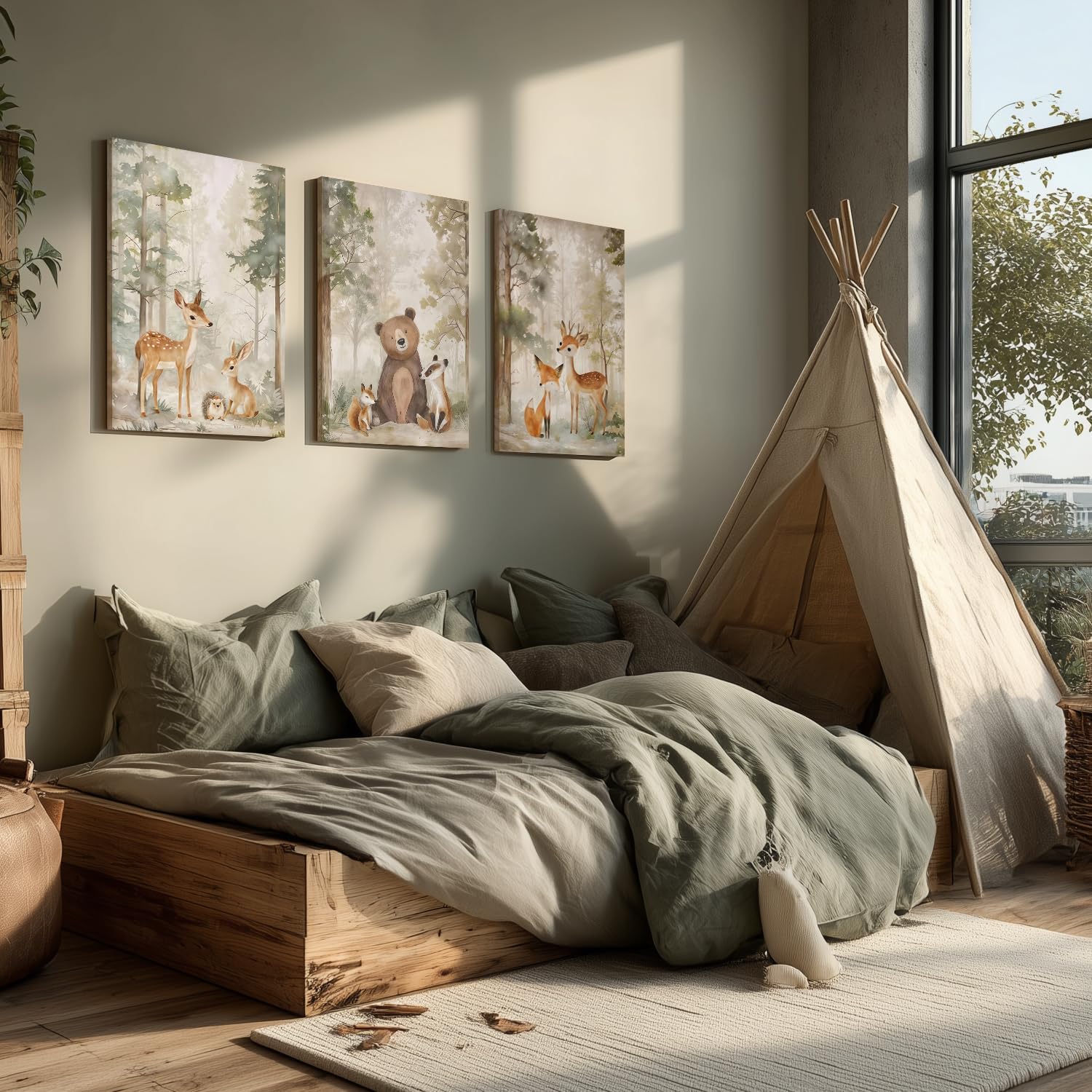 Cyebmo Framed Woodland Animals Wall Art Set of 3, Baby Boy Wild Forest Animals Wall Decor, Deer Bear Fox Wrapped Canvas Painting, Neutral Aesthetic Pictures for Kids Room Benroom Nursery 12″x16″x3