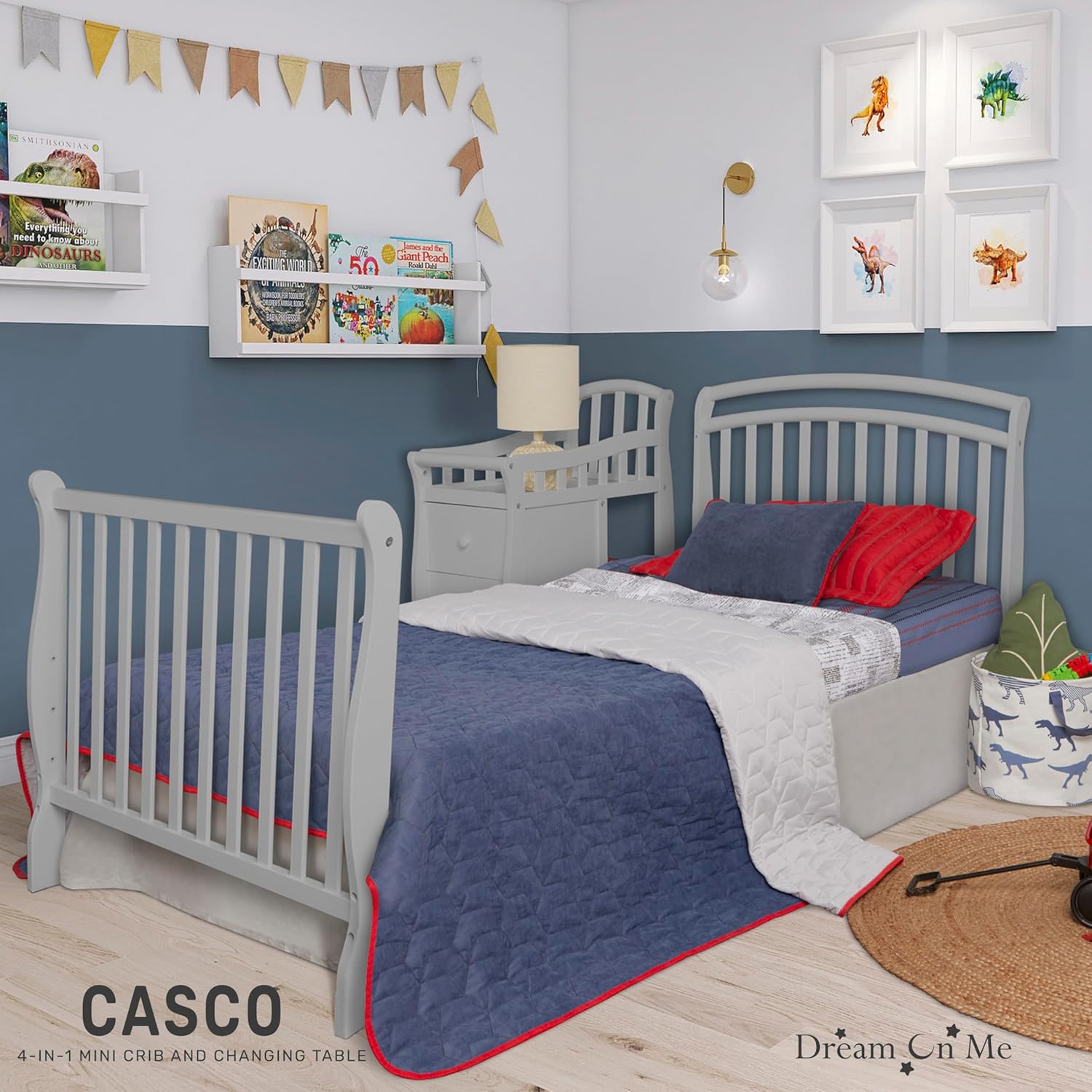 The Dream On Me Casco 4-in-1 Mini Crib & Dressing Table Combo marries style with functionality. It keeps pace with your growing child as it converts it from a mini crib to mini daybed and twin-size bed (bed rails sold separately). It also features a three-drawer changing table. This blend of compact size and utility makes it ideal for smaller spaces. The changing table is equipped with a changing pad and security strap that keep baby safe.NOTE: The changing table can be used as a standalone piece only in twin bed conversion mode. Keep baby essentials handy and organized in 3 spacious drawers! Built of New Zealand pinewood, its minimalist design features gentle, smooth arches & sturdy spade feet. It comes in striking non-toxic finishes allowing it to blend beautifully with any nursery or growing child’s room. It also has a convenient 3-position, adjustable mattress support system. Our mini cribs come with the regulatory one inch mattress pad and we recommend the Dream On Me non-toxic, Greenguard Gold certified mini or portable crib mattress for the perfect fit. All tools/assembly instructions included. All our cribs are designed with a focus on safety, are JPMA certified and meet all applicable ASTM/CPSC standards. Product dimensions are 56.75L x 29W x 41H inches, maximum weight limit is 50 lbs.