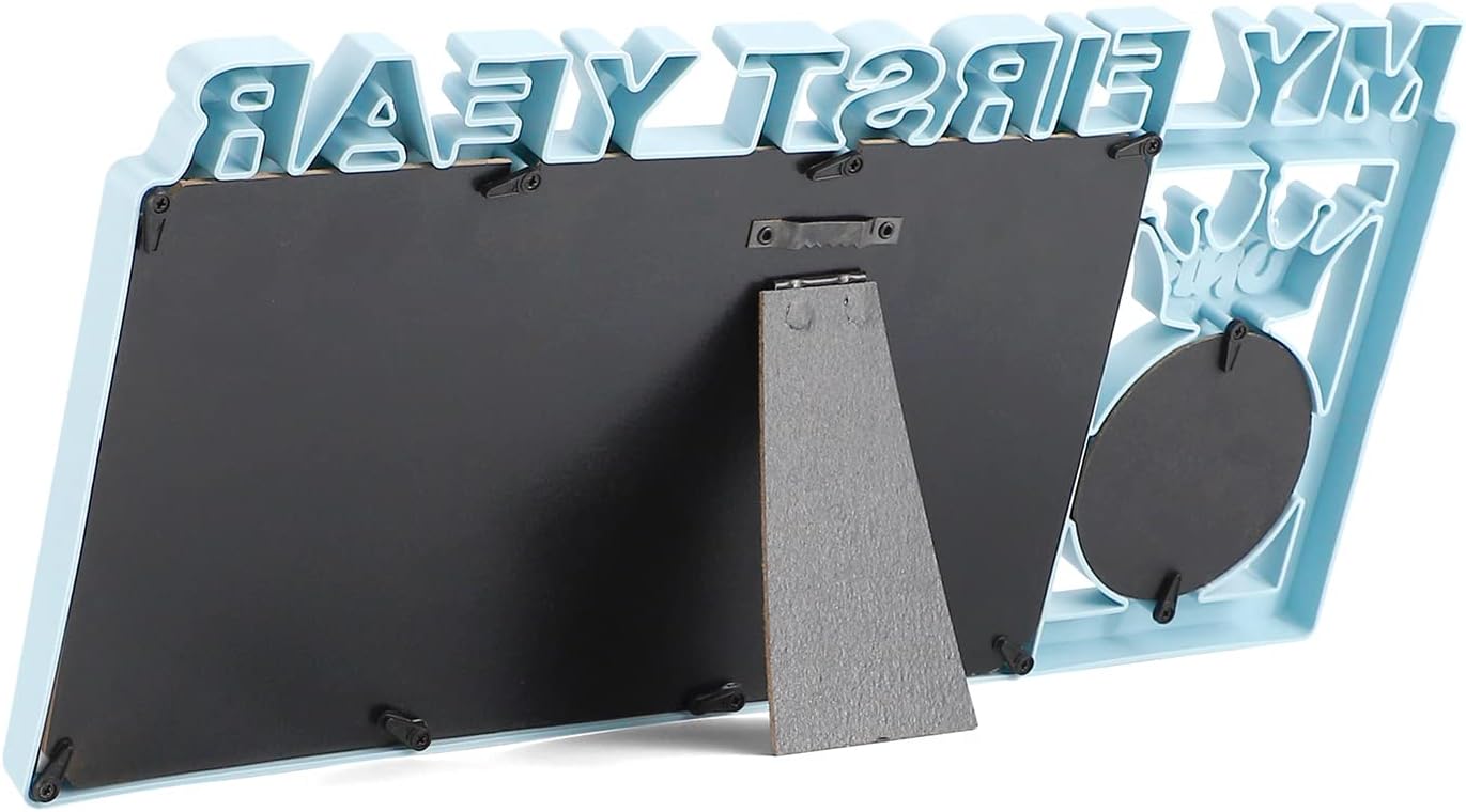 Holds 13 Photos- 1 photo for each month (totally 12 pieces) + 1 memorable photo; the overall size of the baby first year picture frame is approx. 16 x 8 x 1 inch, the rectangular photo slot is approx. 2.2 x 1.4 inch and the round photo slot is about 2.8 inch in diameter