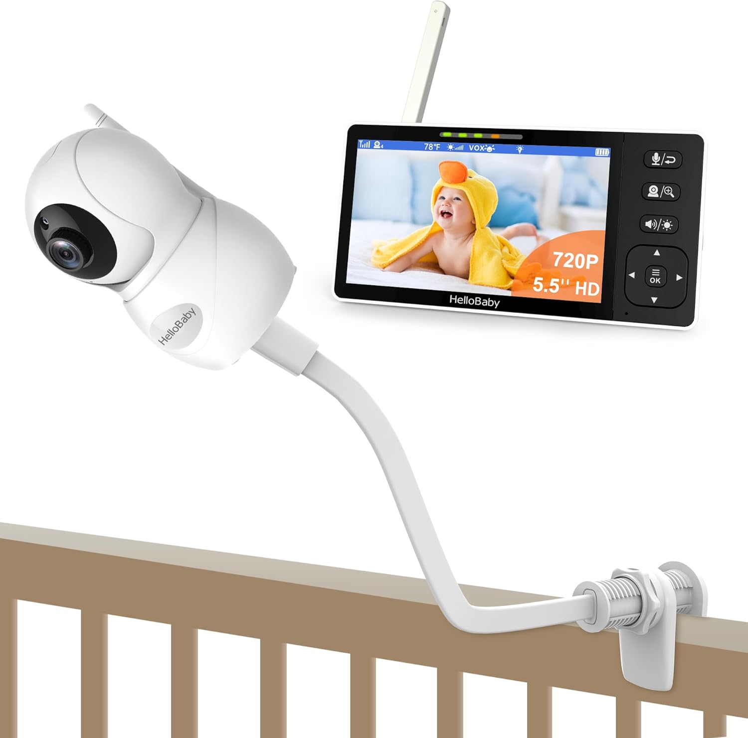 Hello Baby Wall Mounted Baby Monitor 720P Large 5.5″ IPS Screen: HelloBaby baby camera monitor HB6081 allows you to see more of your baby and their adorable moments with an expansive 5.5-inch 720P portable display, reduced latency time by 70%. Its improved 720P clearance screen offers better brightness, sharpened viewing angles, and a vivid color display, giving you exceptional clarity video day and night, even in low-light settings.