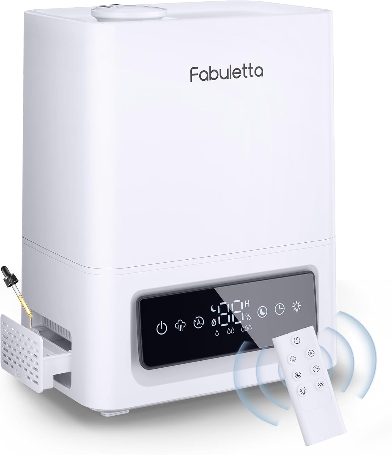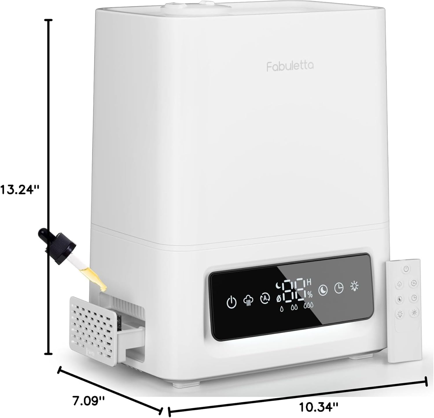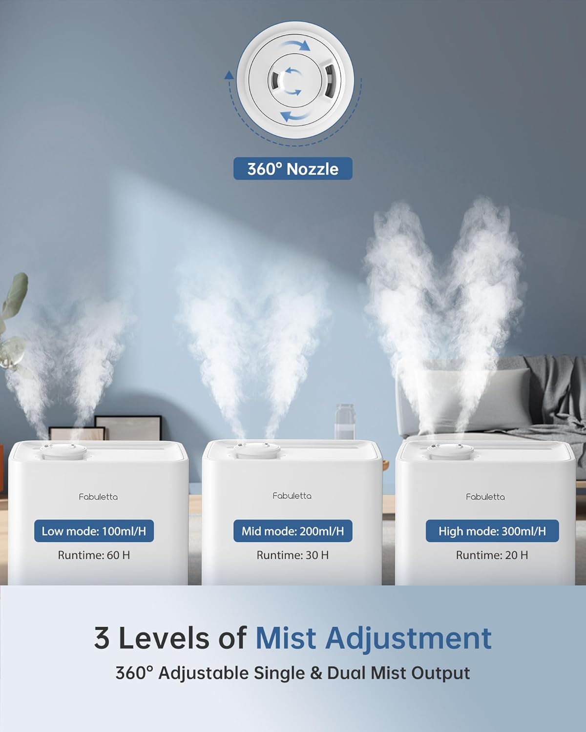 【High-Performance Humidifier for Large Spaces】Experience the power of our 2.4Mhz high-frequency atomizer humidifier, which produces a lighter, more delicate mist that stays suspended in the air, preventing any dampness on your floors or furniture. The Fabuletta FHM002 humidifier large room reaches your desired humidity faster with its 360° dual mist outlets. Plus, with a remote control, you can easily adjust settings from across the room.