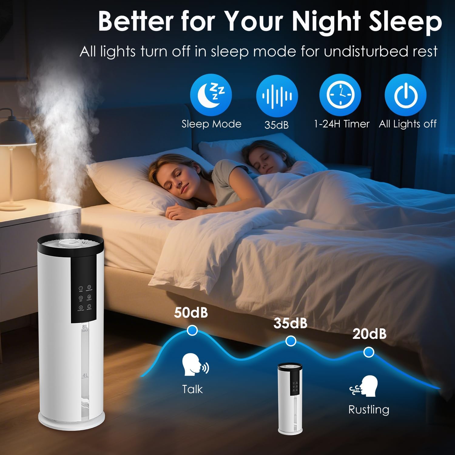 𝑸𝒖𝒊𝒆𝒕 𝑯𝒖𝒎𝒊𝒅𝒊𝒇𝒊𝒆𝒓𝒔 𝒇𝒐𝒓 𝑩𝒆𝒅𝒓𝒐𝒐𝒎: This cool mist humidifier operates at a whisper-quiet 35dB in sleep mode, ensuring undisturbed sleep. The bedroom humidifier features soft 7-color breathing lights, which can be fully turned off in sleep mode. For added convenience, everything can be easily controlled from up to 20 feet away with the included remote, allowing one-touch adjustments without leaving your bed