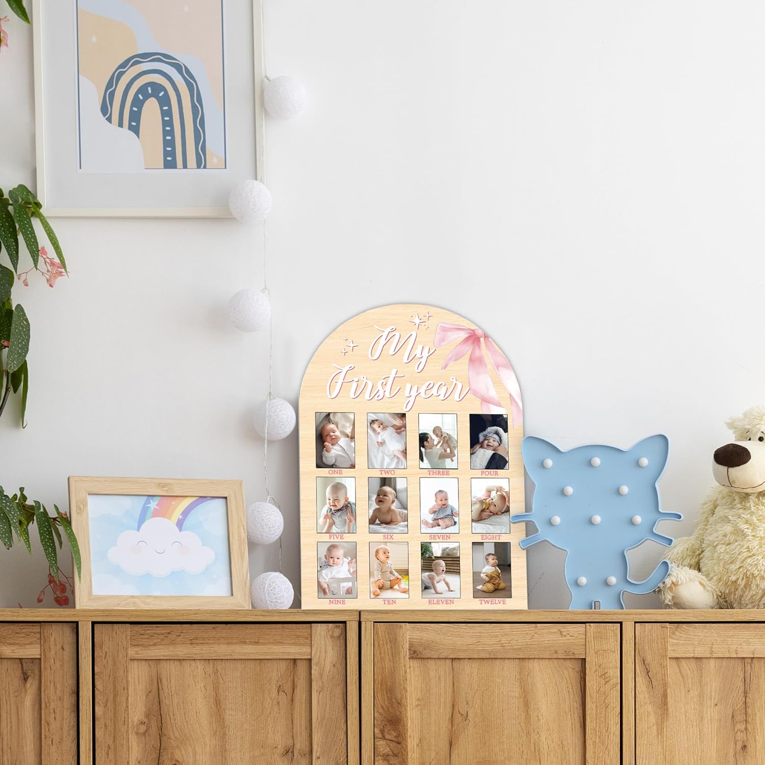 My First Year Milestone Photo Board, One Year Of Wood Photo Board, 12 Monthly Baby Picture Frame, Pink Bow Nursery Decor, Girl Boy 1st Birthday Decorations, Baby Shower Keepsake Best Gift-A15
