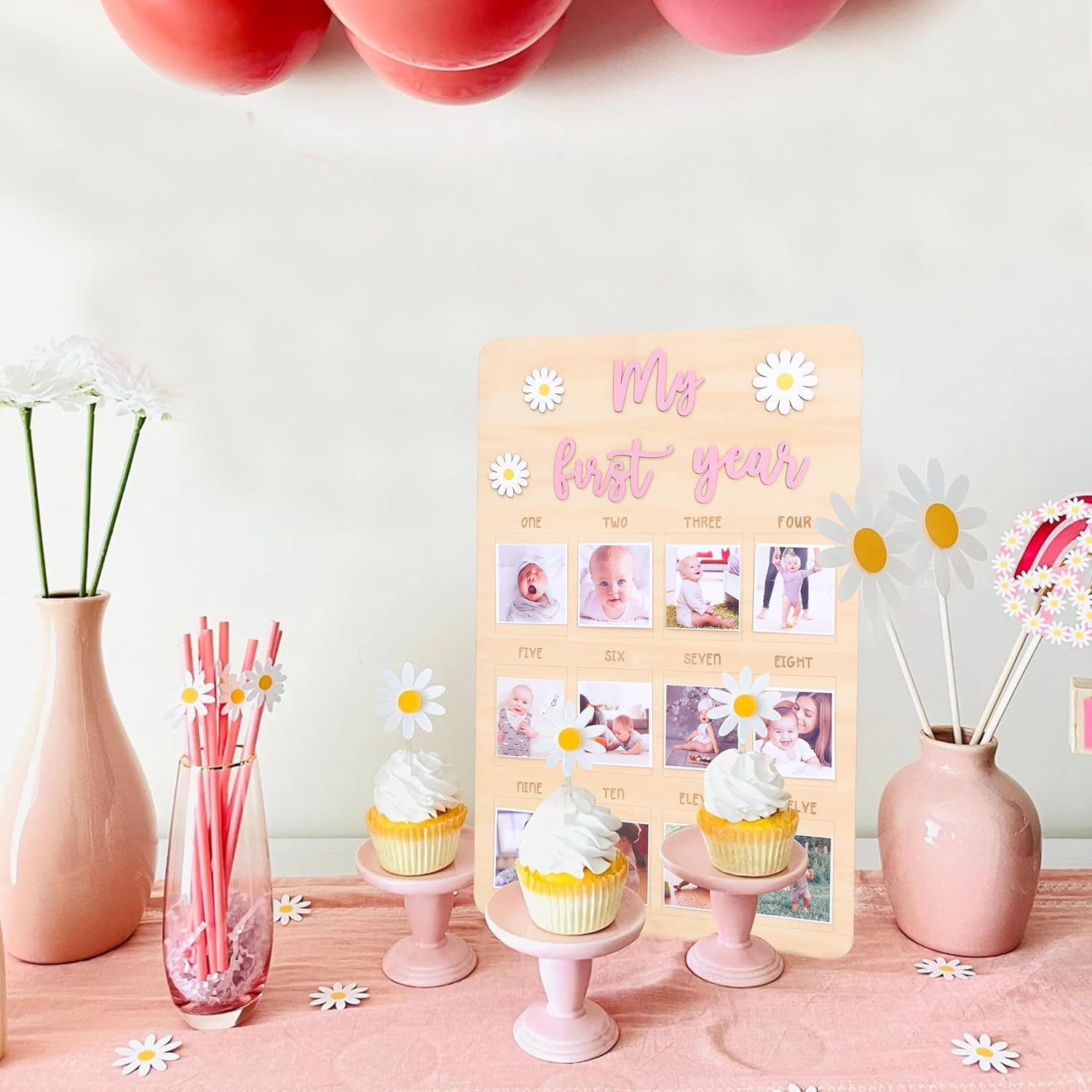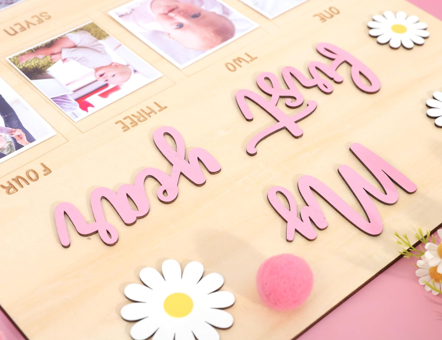 DAISY FLOWER DESIGN: Adorned with a charming daisy flower pattern, this photo board exudes elegance and sweetness, making it a delightful addition to any nursery or living space. The floral motif complements any birthday theme, adding a touch of nature’s charm to the celebration.
