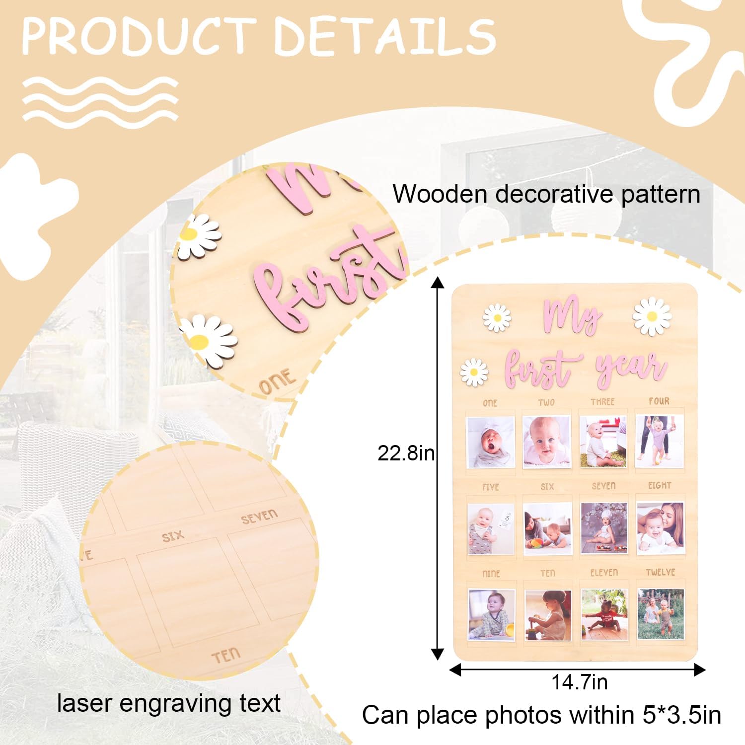 HIGH-QUALITY WOOD MATERIAL: Crafted from premium wood, this photo board is sturdy and durable, ensuring it stands the test of time. The smooth finish is gentle on little hands, making it safe for curious toddlers to explore and admire their memories.