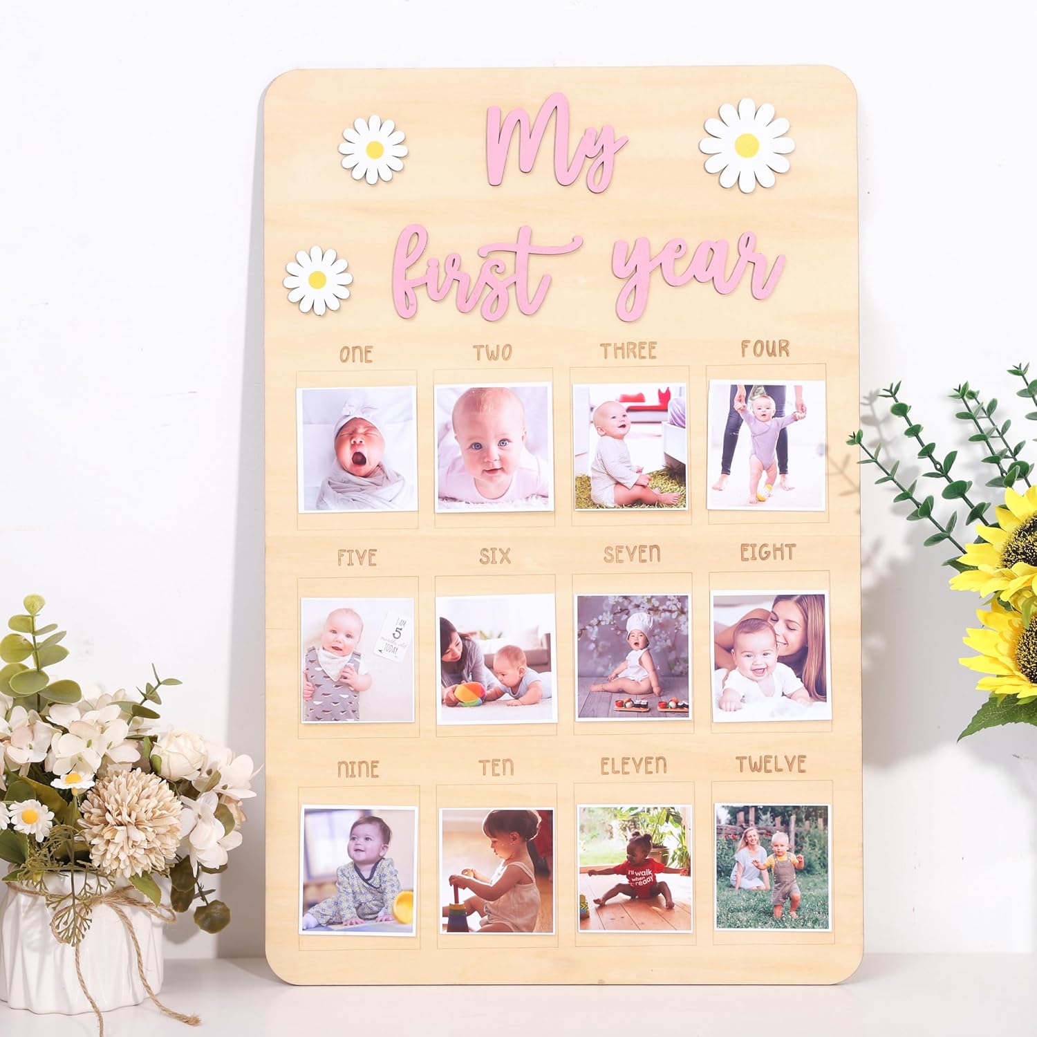 Capture every precious moment of your baby’s first year with this adorable daisy-themed photo board! Perfect for monthly milestone pictures, this personalized wooden frame lets you document your little one’s growth from month 1 to 12 in the sweetest way. Whether it’s for your baby girl or boy, this keepsake makes a heartfelt gift and a cherished nursery decoration.