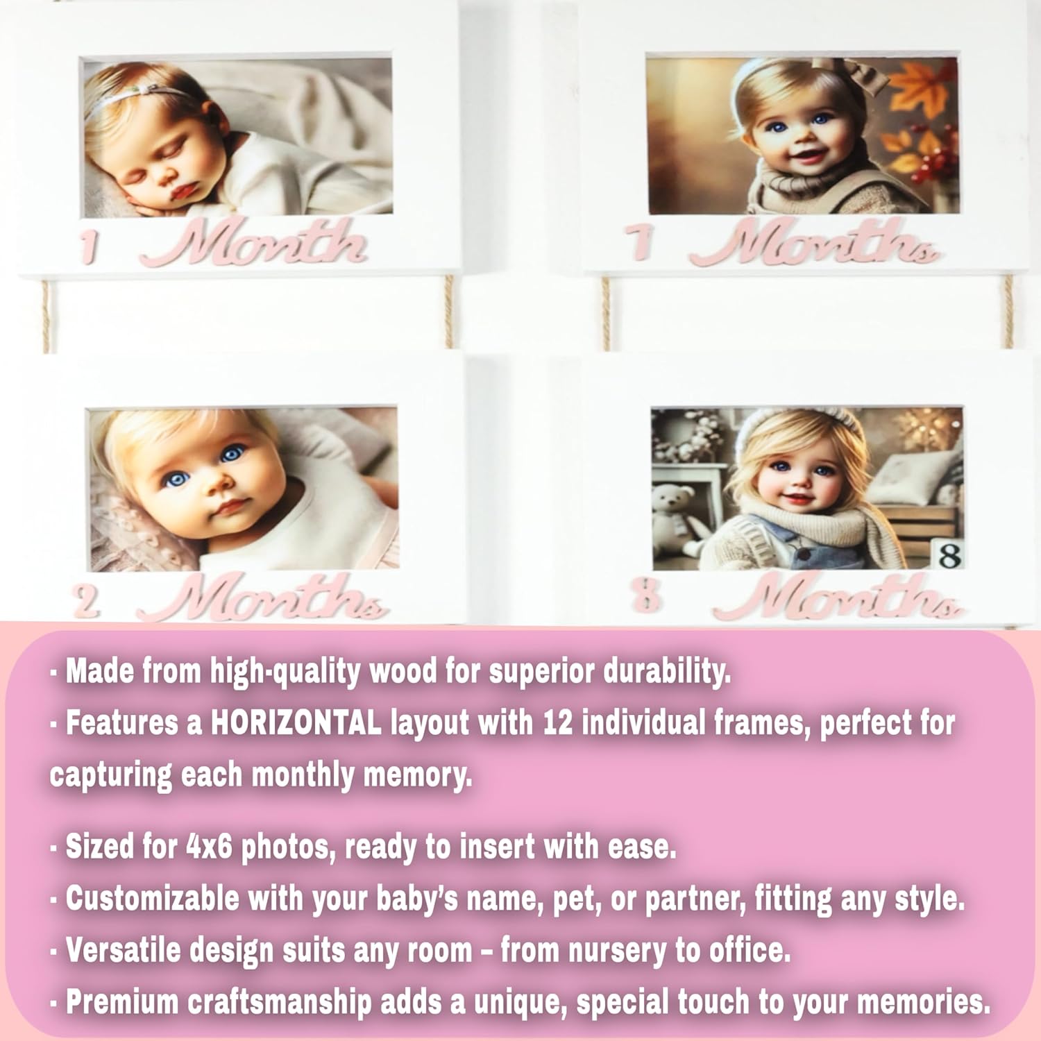 EXCLUSIVE 12-FRAME SET: Unique collage picture frames with 3D wooden month markers (1-12), perfect for creating baby photo albums documenting baby monthly milestone with 12 month pictures for baby first year. Ideal for new parents and baby shower gifts.