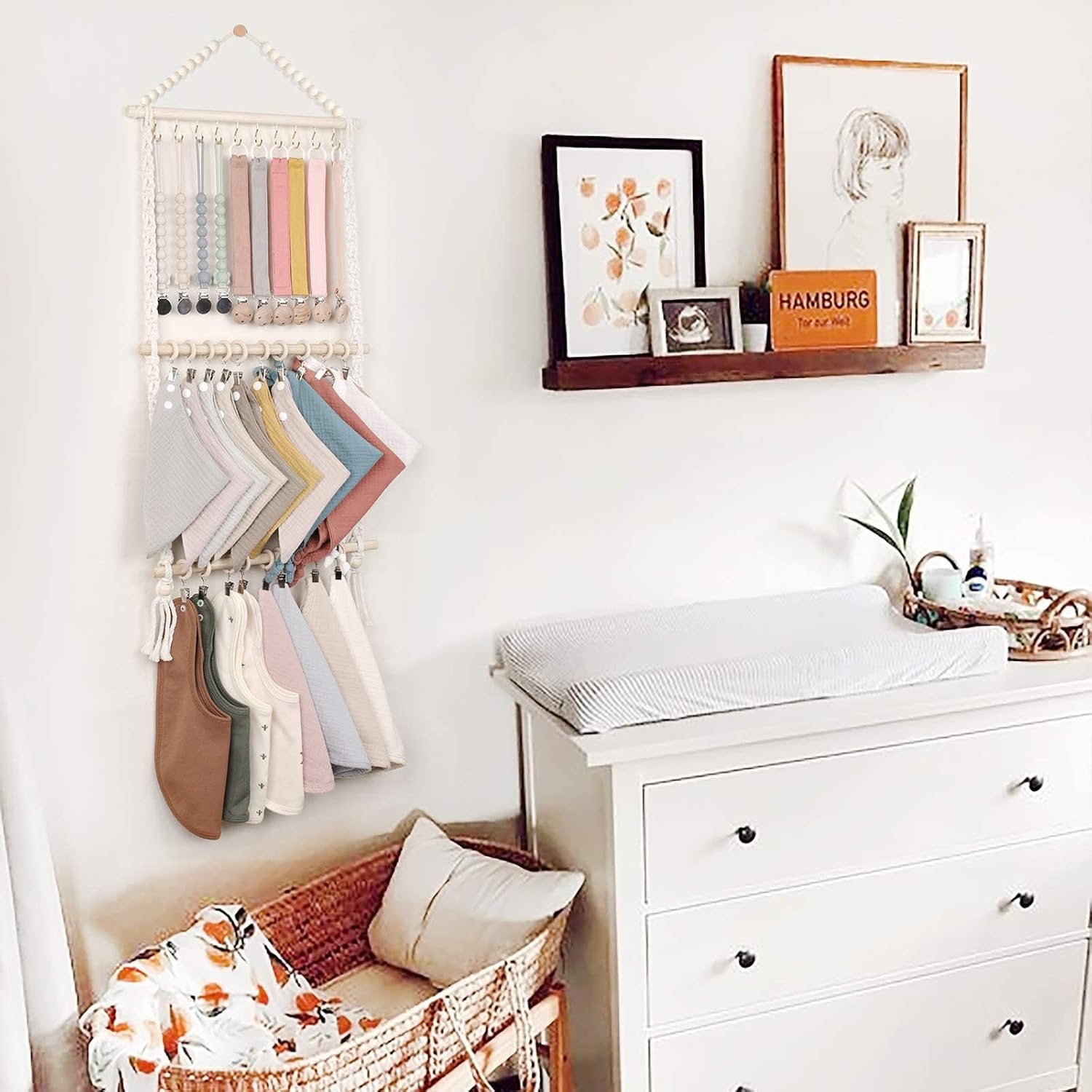 Strong And Durable: Our pacifier holder adopts stable and solid metal hook inlay technology, which can not only orderly store and display pacifier clips, but also maintain the balance of the storage rack. The baby bibs holder adopts a wooden ring clamp,not only can it slide freely and select conveniently, but also it is very durable.