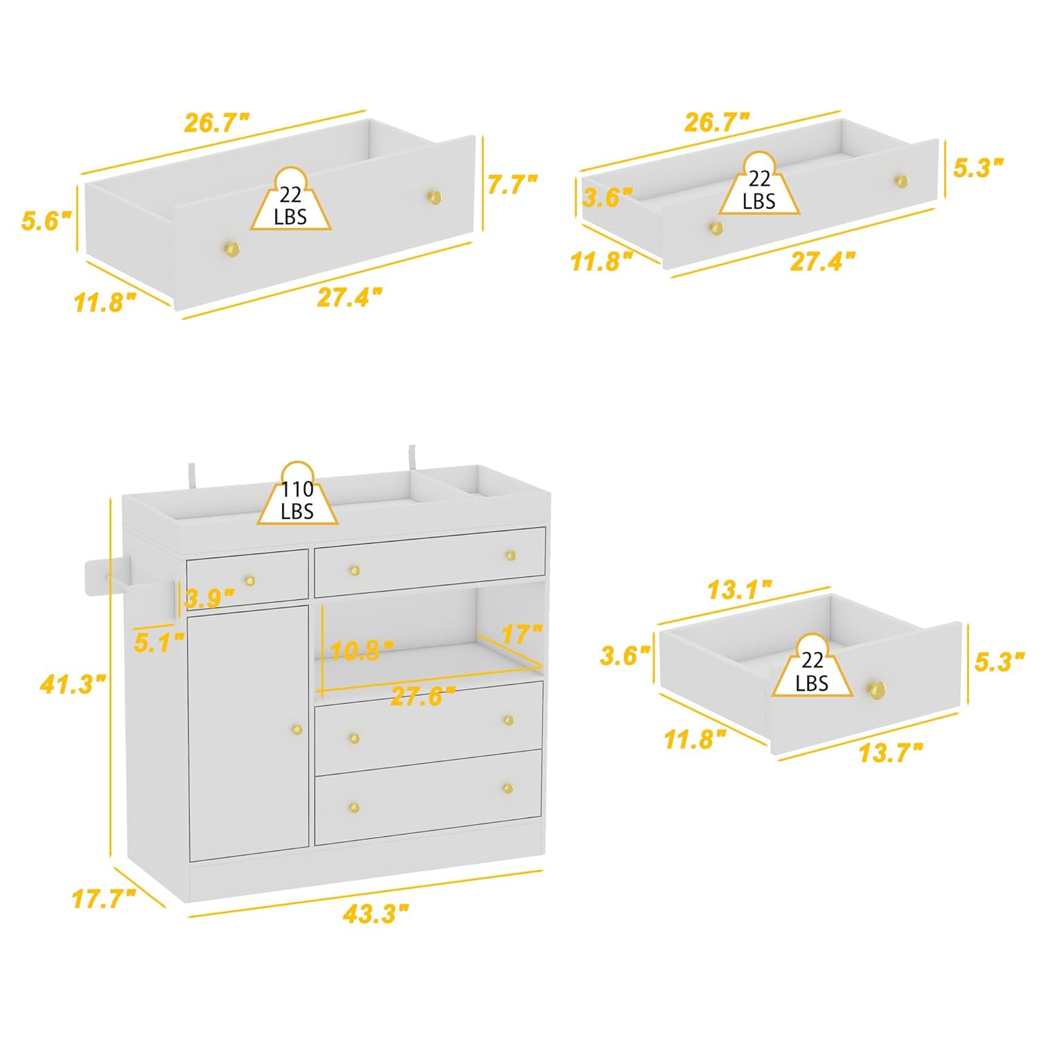 [Stylish & Functional] – The white finish with gold handles is elegant and stylish, helping you create a cozy nursery. With 4 drawers and 2 shelves, it is convenient for you to store and organize clothes, toys and other baby’s items. There are 2 organizers behind the doors to provide additional storage space. Changing table dimensions: 17.7″D x 43.3″W x 41.3″H