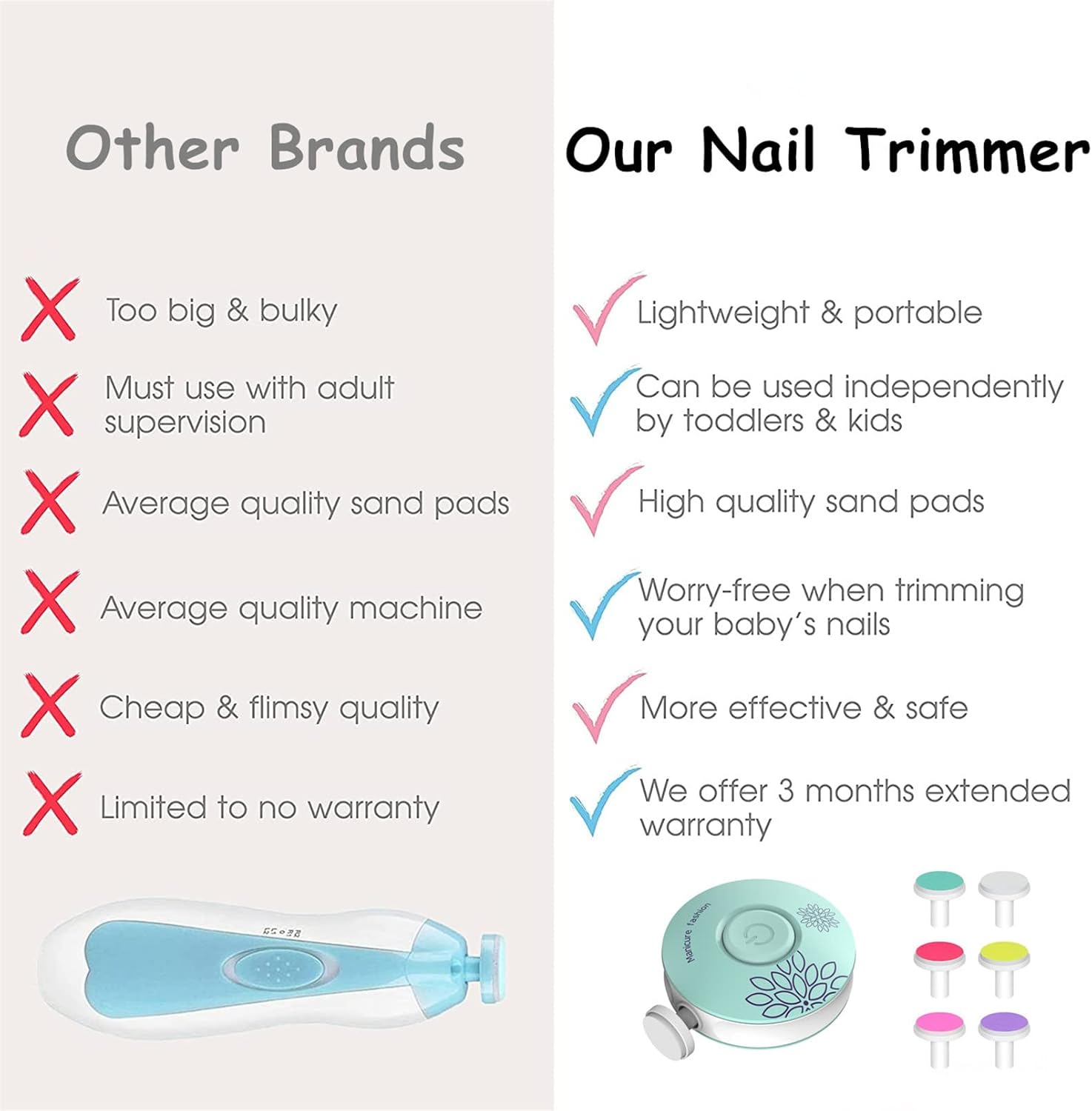 【6 in 1 Nail Care Kit For Baby and Adults】:This electric baby nail trimmer has 6 grinding heads. Designed for different stages of babies’ growth and various needs. Red grinding head (for 0-6 months baby), purple grinding head (for 6-12 months baby), mint green grinding head (for 12 months and up baby). Electric nail file also comes with 3 colored head for adults, including soft grinding heads for polishing. So the manicure set can be used for newborn, infant, toddlers, kids from 0-12 months.