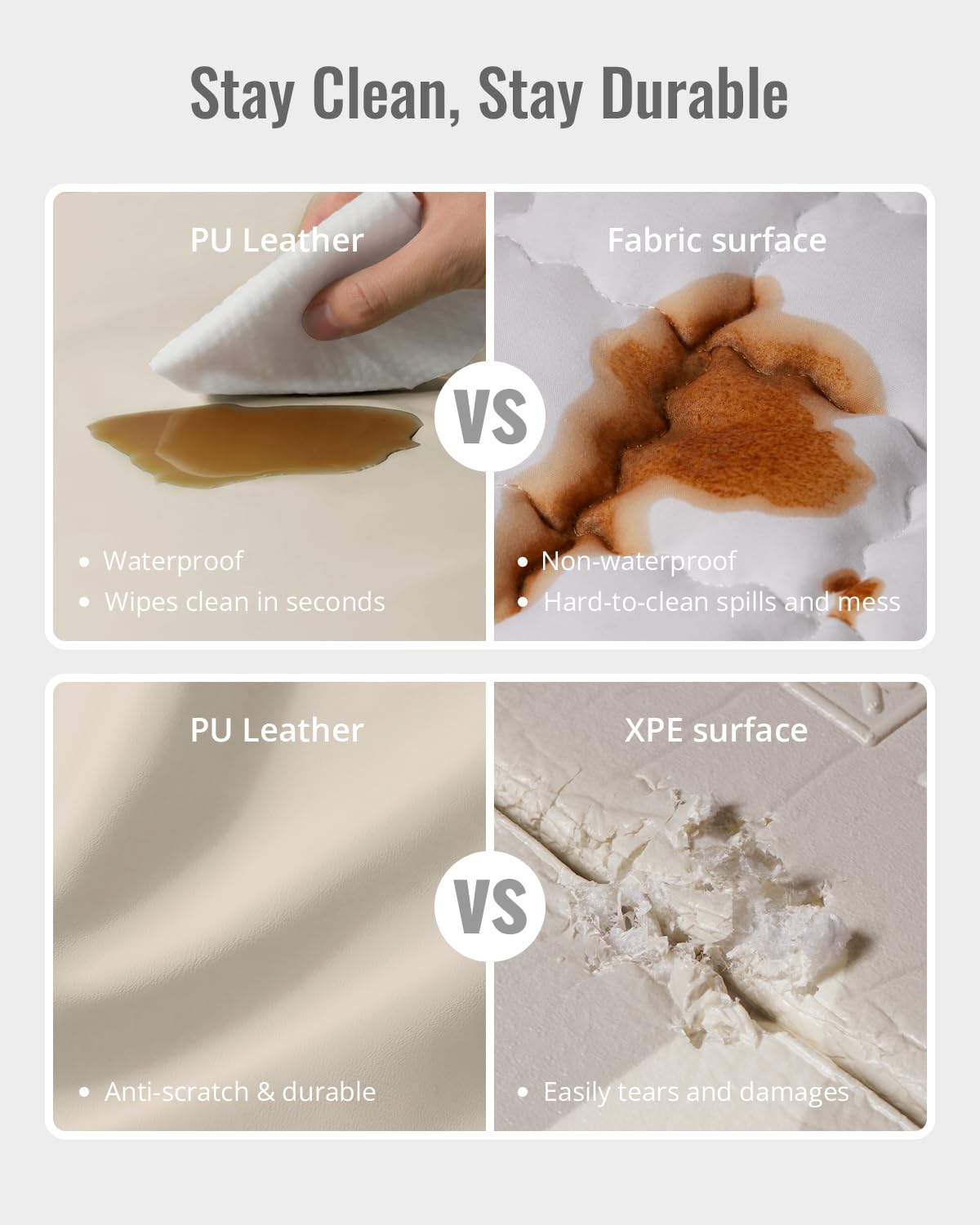 Durable Vegan Leather for Long-Lasting Use: Our baby play mat surface is crafted from high-quality vegan leather, offering superior durability compared to traditional XPE mats. The premium surface is designed to resist wear and tear from everyday use, maintaining its stylish appearance. This mat provides a reliable play area that stands the test of time