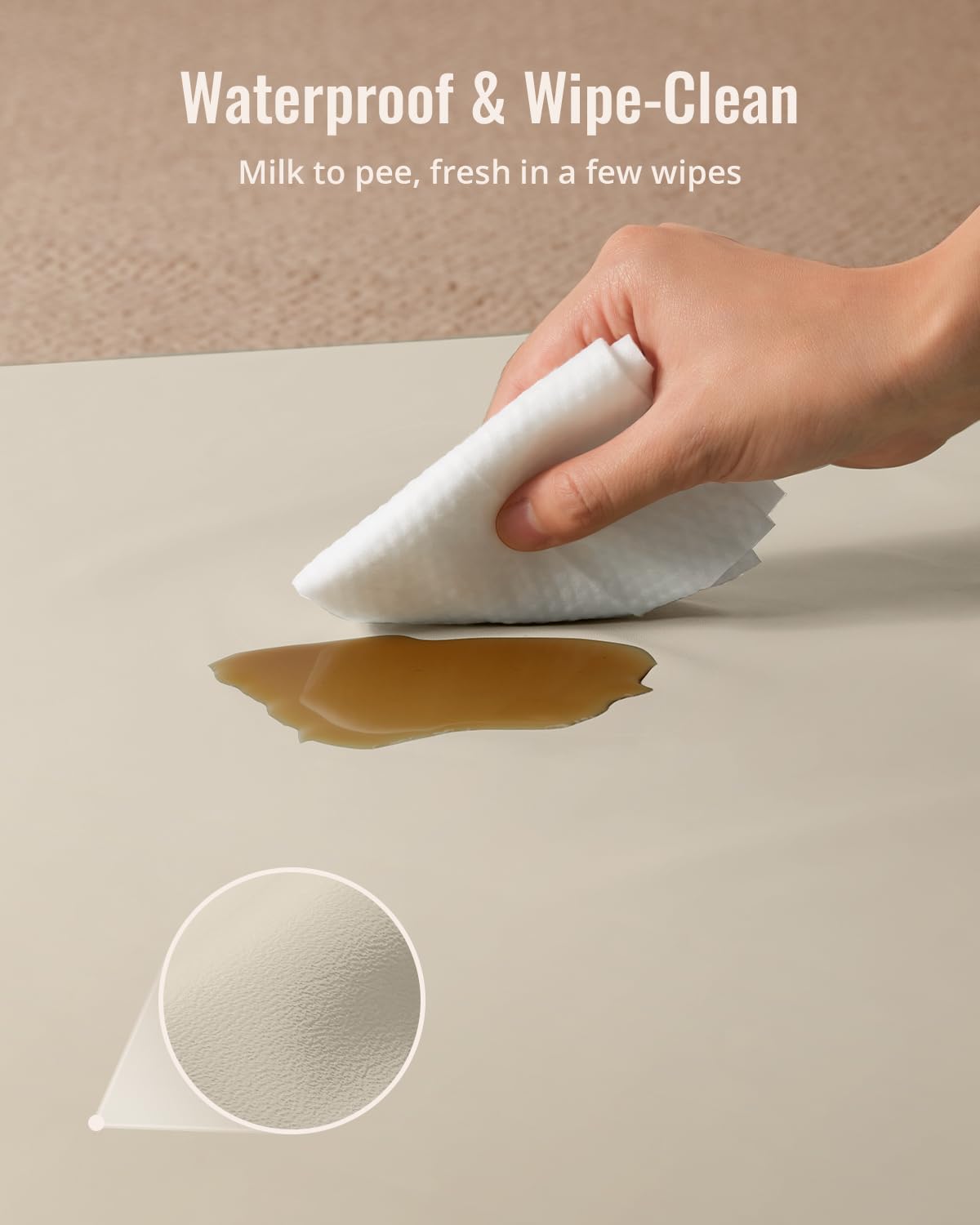 Waterproof & Easy to Clean: Unlike many other mats that absorb spills, this Vegan leather baby play mat is 100% waterproof, making it effortless to clean. Just wipe it down with a damp cloth to remove food, milk spills, or any other mess, keeping your baby’s play area spotless and hygienic