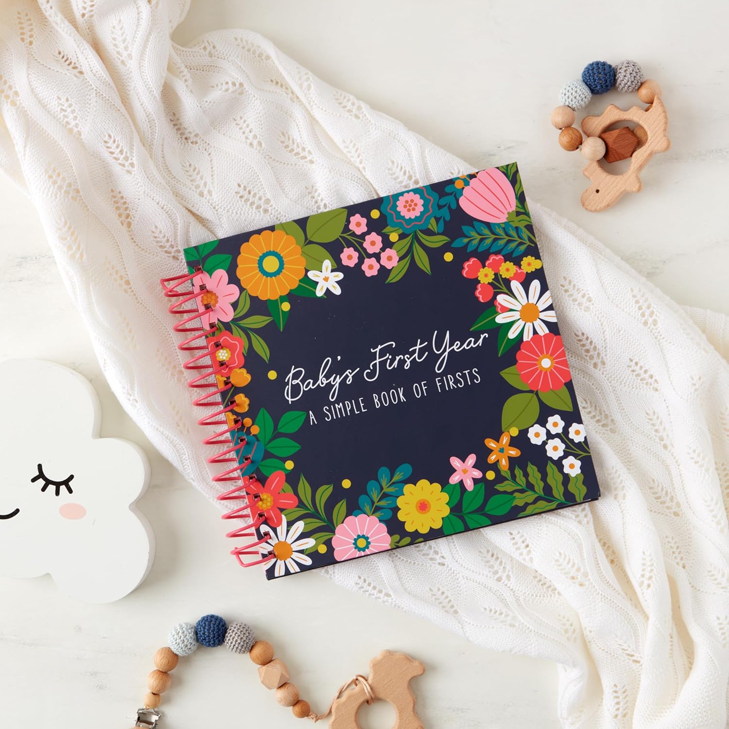 Floral blooms sprout amidst pinks, golds, greens, and navy blue in this gender neutral first year baby photo album