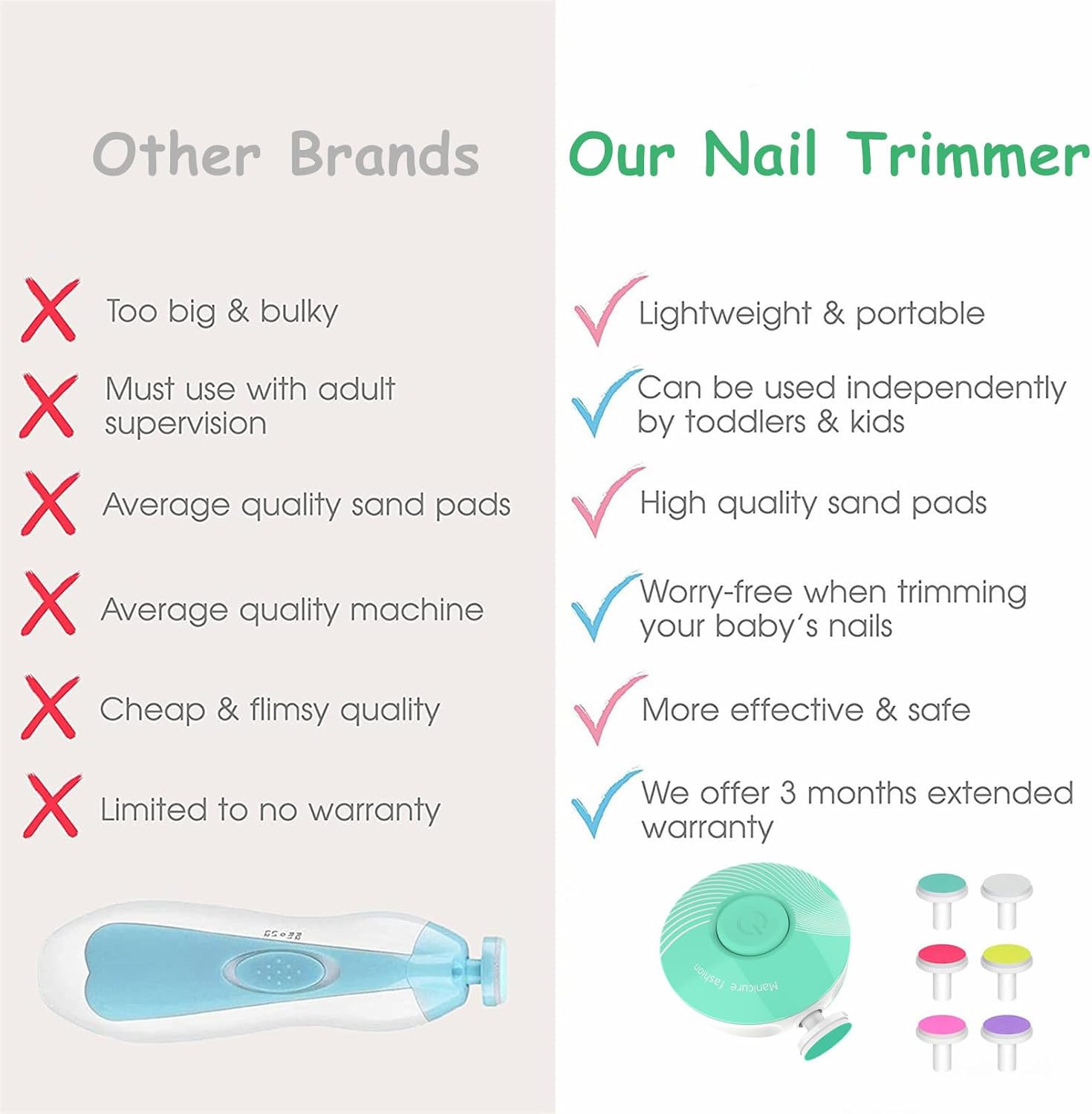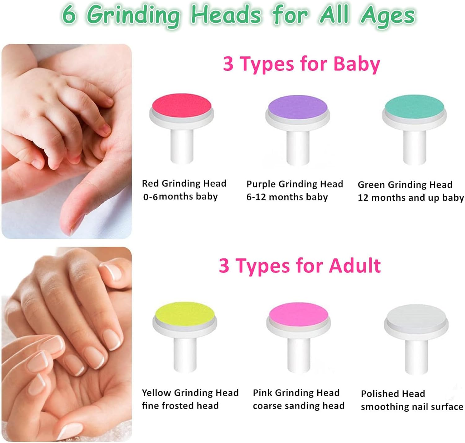 [6 in 1 Nail Care Kit For Baby and Adults] – This baby nail trimmer electric has 6 grinding heads. Designed for different stages of babies’ growth and various needs. Red grinding head (for 0-6 months baby), purple grinding head (for 6-12 months baby), mint green grinding head (for 12 months and up baby). Electric baby nail file also comes with 3 colored head for adults, including soft grinding heads for polishing. So the manicure set can be used for newborn, infant, toddlers, kids from 0-12 months.