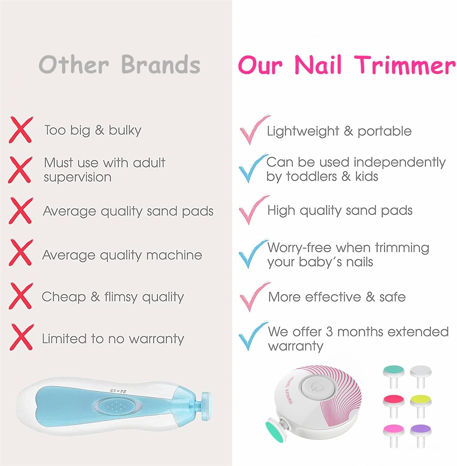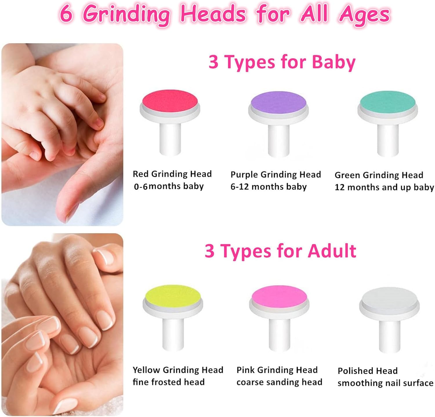 [6 in 1 Nail Care Kit For Baby and Adults] – This baby nail trimmer electric has 6 grinding heads. Designed for different stages of babies’ growth and various needs. Red grinding head (for 0-6 months baby), purple grinding head (for 6-12 months baby), mint green grinding head (for 12 months and up baby). Electric baby nail file also comes with 3 colored head for adults, including soft grinding heads for polishing. So the manicure set can be used for newborn, infant, toddlers, kids from 0-12 months.