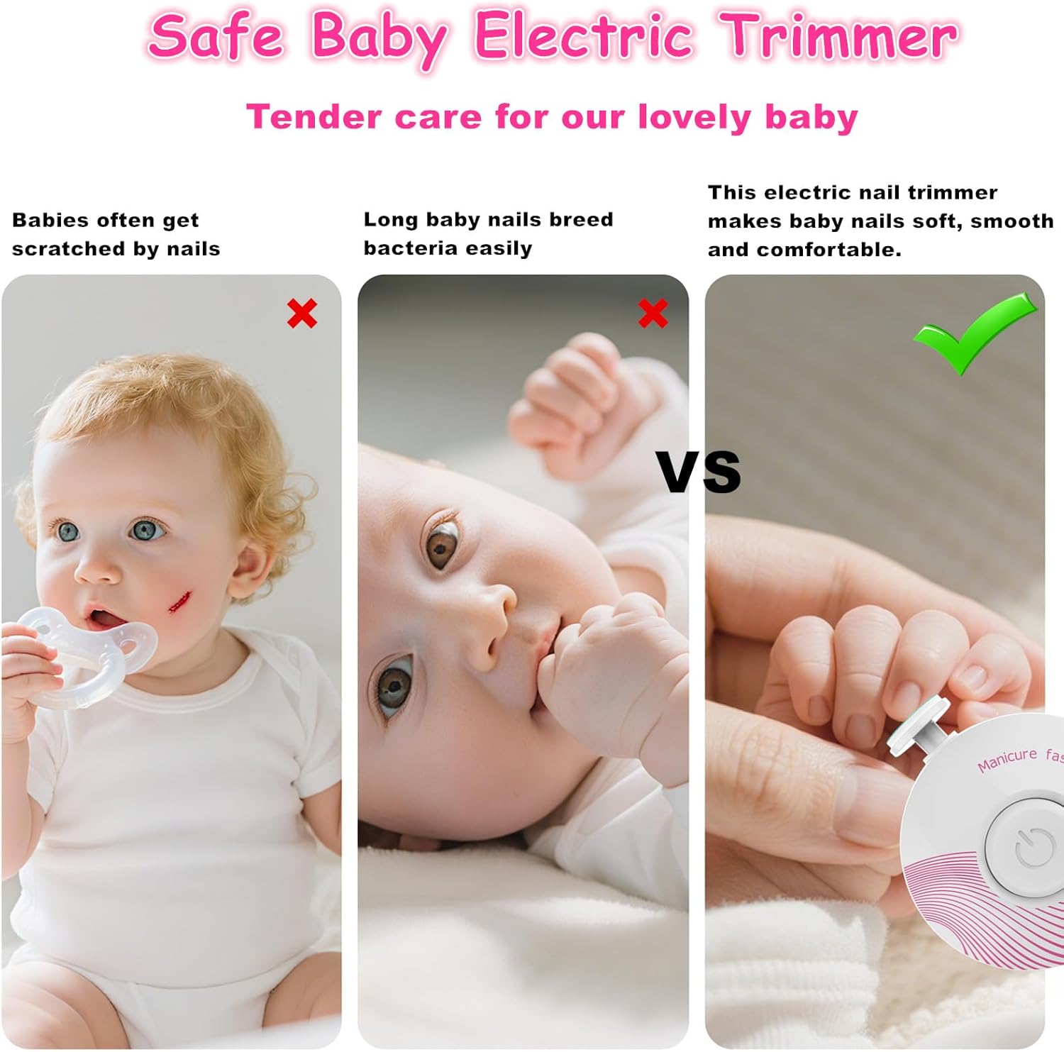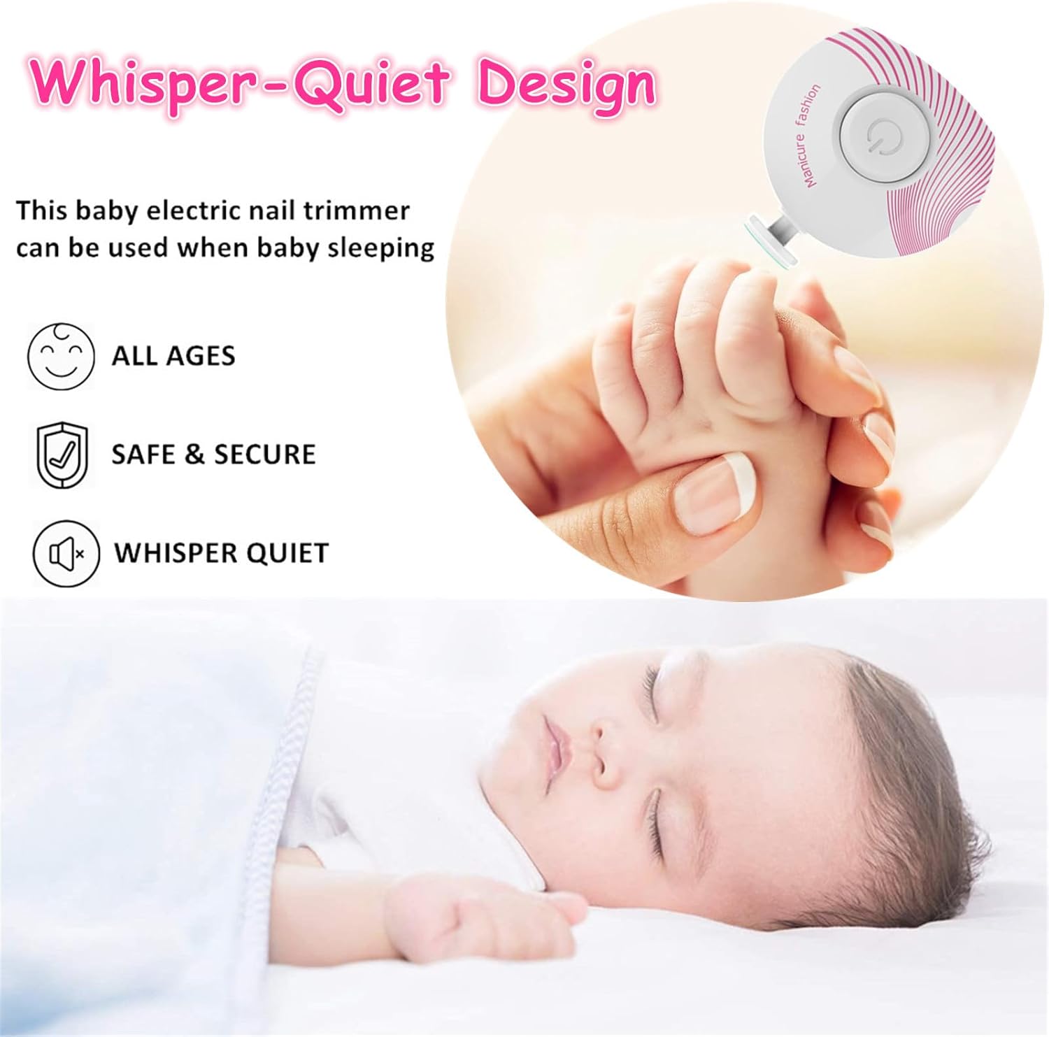 [Whisper-quiet Operation] – Boasting whisper-quiet motor, with this electric baby nail trimmer you can trim baby nails while they’re sleeping without them ever knowing. Always enjoy a gentle manicure using baby electric nail trimmer with CE , RoHS approval.