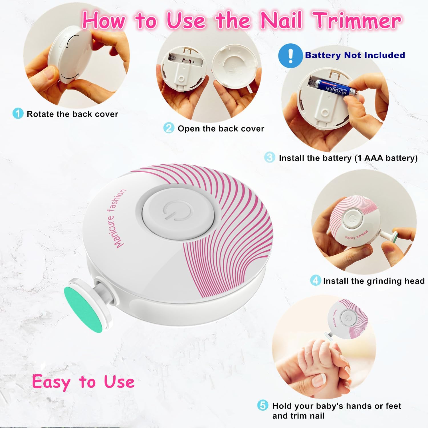 [Safe and Effective] – The sharpening heads are gentle and only takes a few seconds. The baby electric nail file can safely round baby’s nails without damaging cuticle or soft nail bed. The electric baby nail file Only 1 AAA battery is required (battery NOT included).