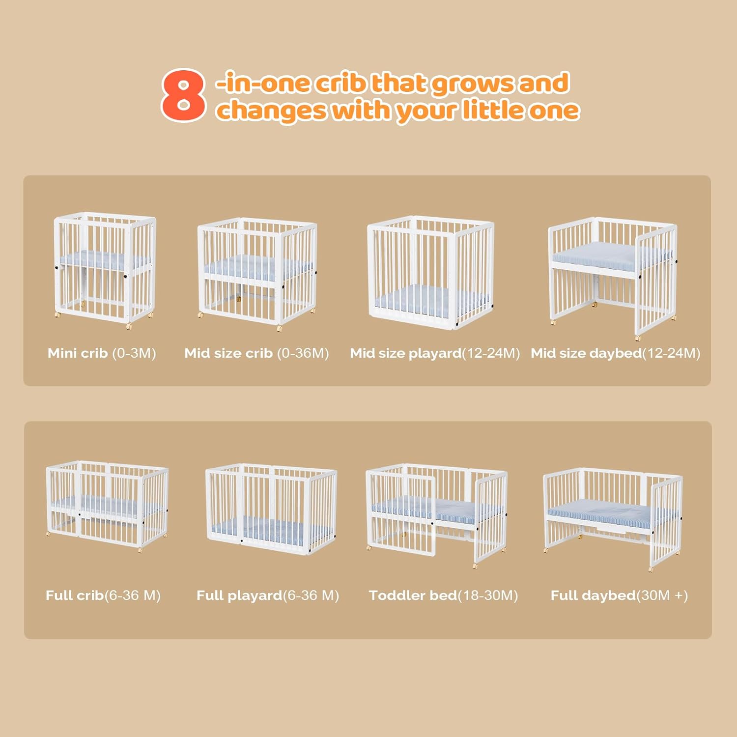 8-in-1 Convertibility: This baby crib seamlessly transforms through 8 different configurations across 3 sizes. bassinet, mid size crib, mid size daybed, mid size playard, full-size crib, full toddler bed, full daybed, and full playard, no conversion kits needed (Mini and mid size are not a standard size)