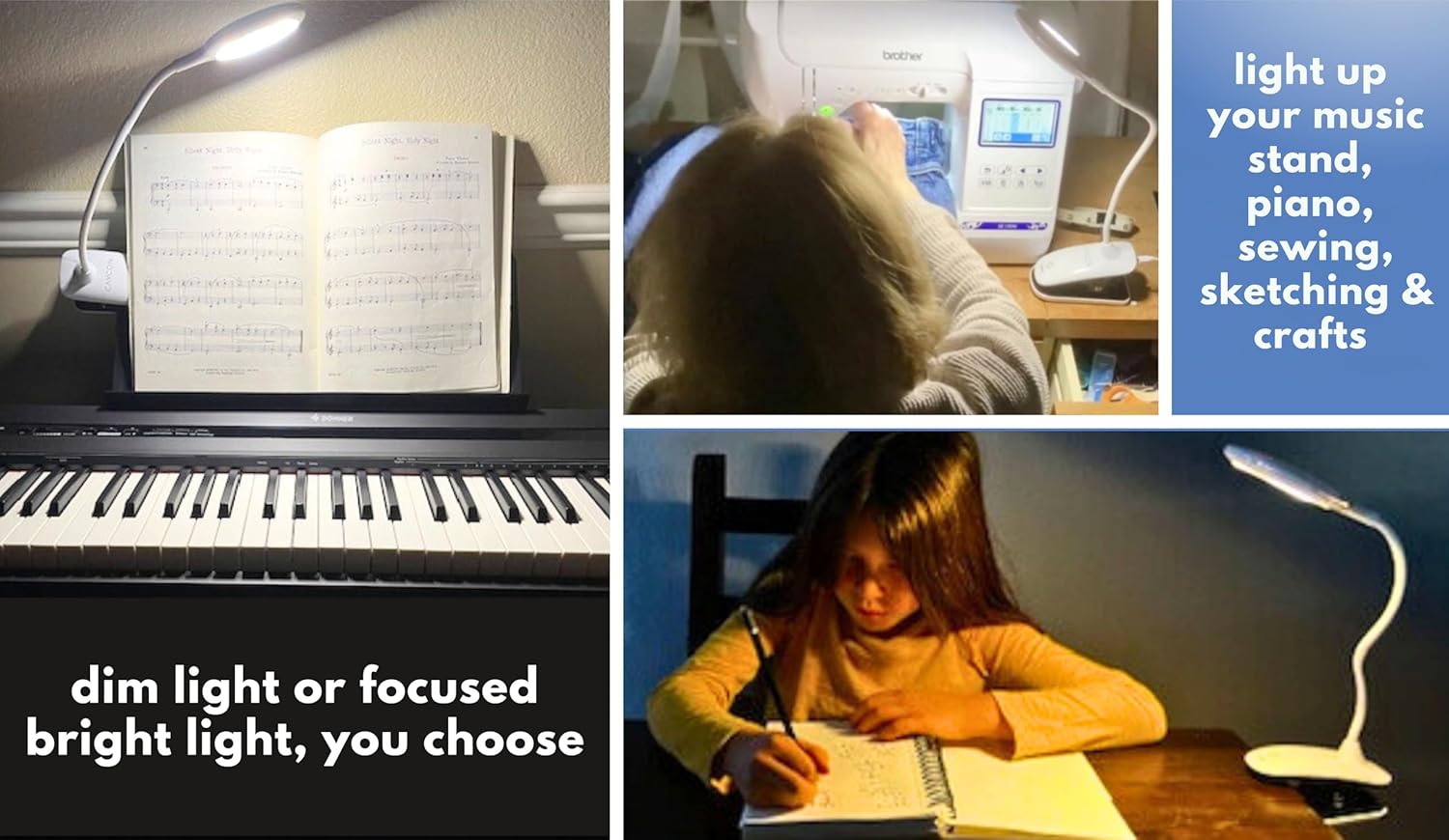 Ideal task light for crafting, embroidery, sewing, or needlework—clearly see every stitch and thread Clips easily to music stands—perfect piano light or instrument light Great for artists, illustrators, and coloring books—flexible neck lets you adjust the angle with ease Silent, flicker-free LED makes it the perfect light for meditation, journaling, or bedtime rituals A great gift for hobbyists, crafters, piano teachers, or night owls who appreciate soothing light