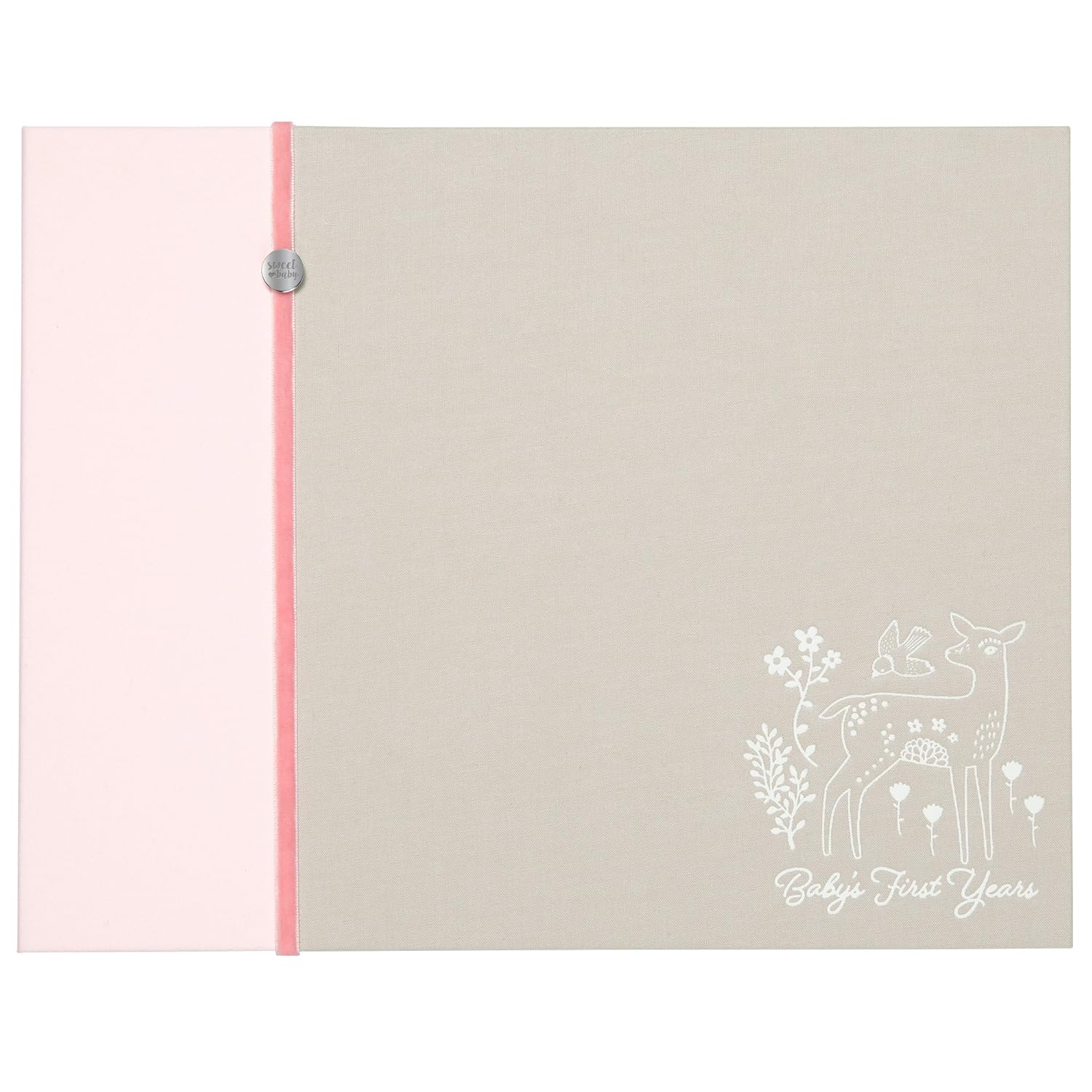 This attractive memory book features a pink and gray fabric cover with an adorable embossed deer illustration and a decorative ribbon.
