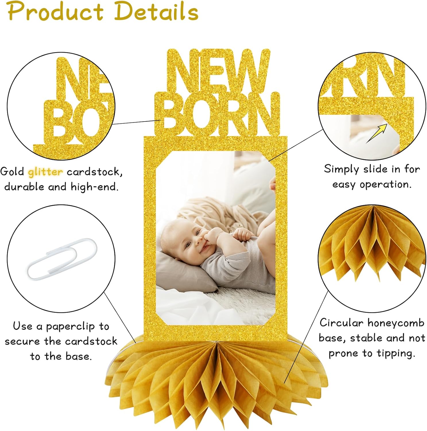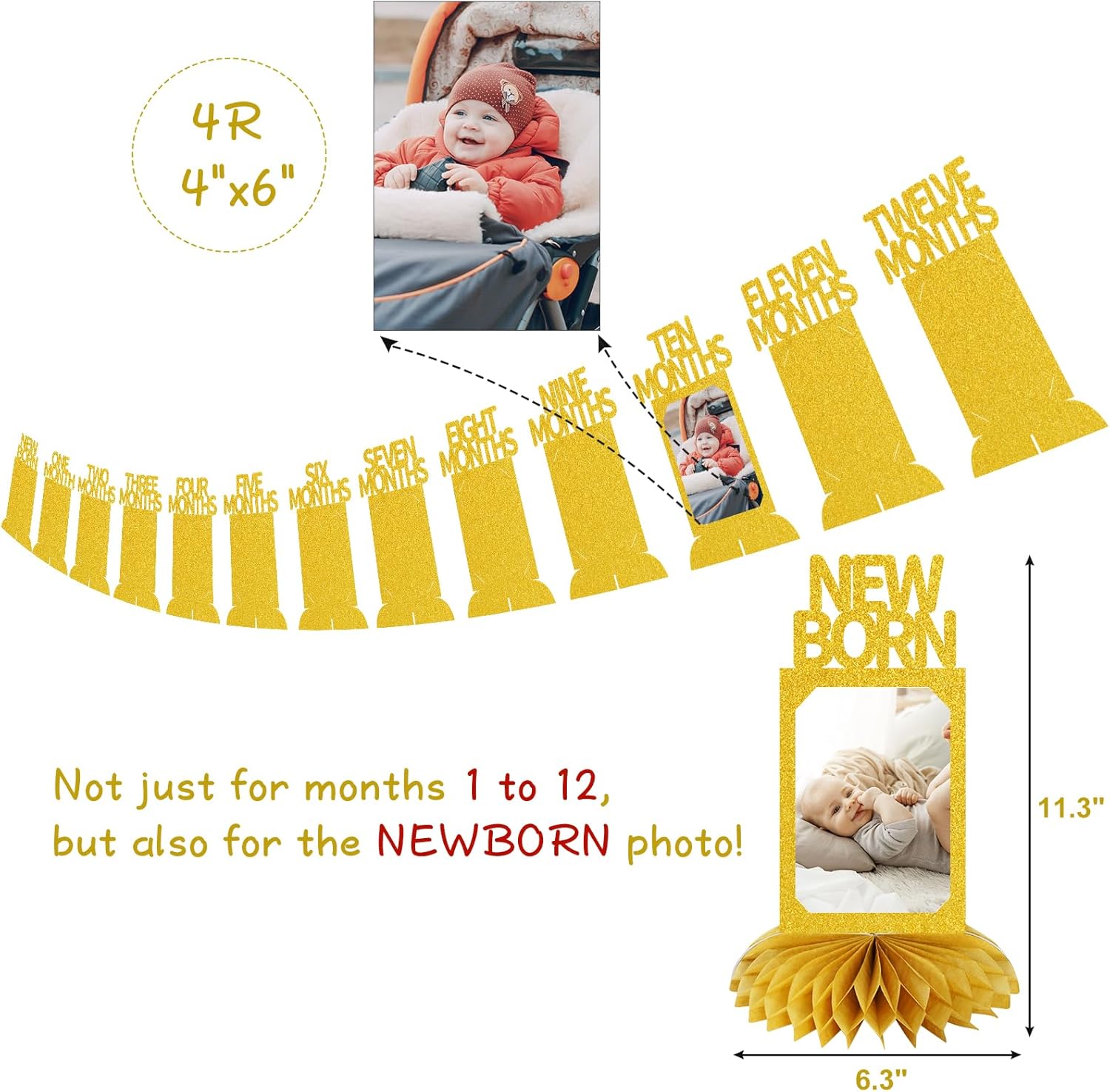 [Well-Made Material] The 1st Birthday Photo Honeycomb includes 12 months and a ‘NEW BORN’ card. The sturdy cardstock, treated for a luxurious golden sheen, enhances the honeycomb’s texture, making it a standout at the party.
