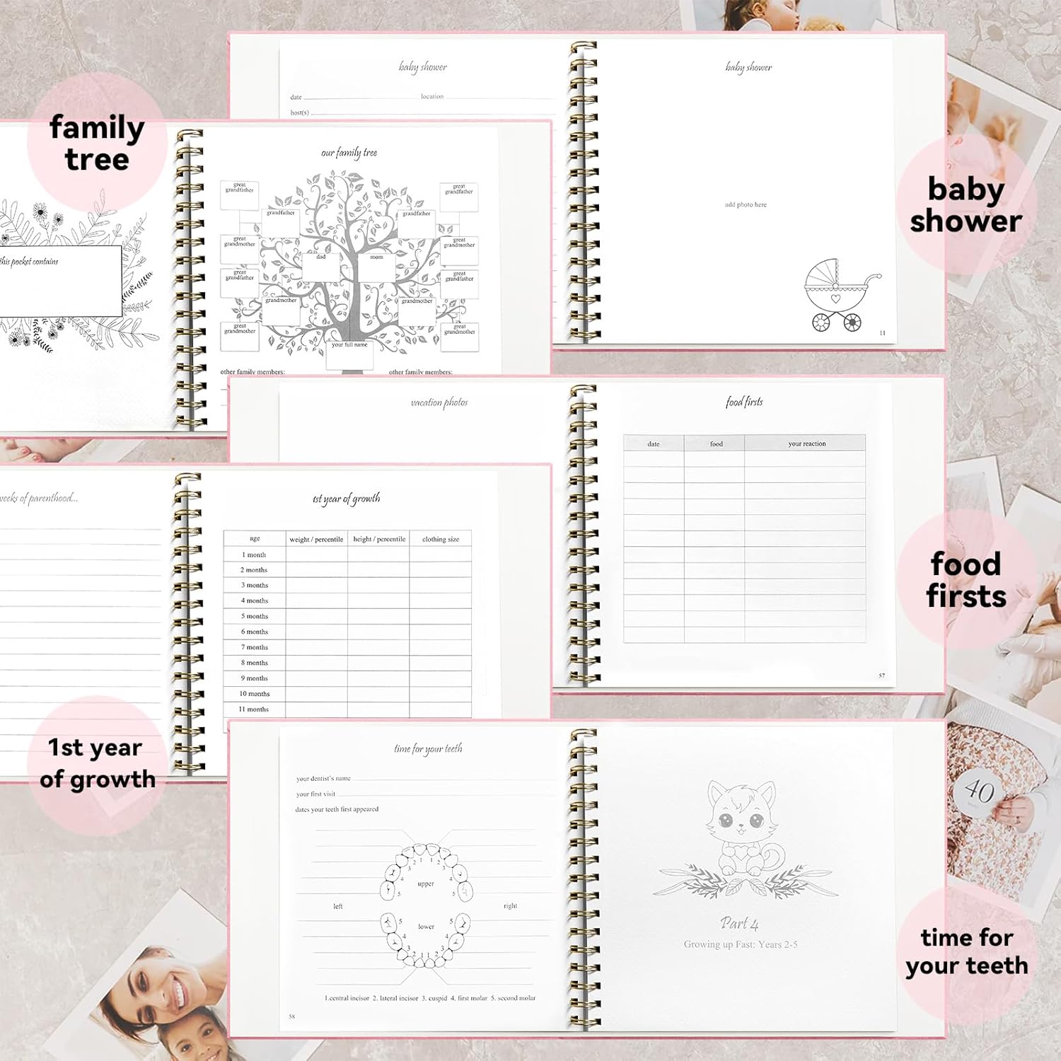 Very Practical Design: 1, Easy-to-use index with page numbers – Makes it simple to navigate through baby’s milestones, lets you jump straight to cherished moments; 2, 5 Keepsake Pockets – Store hospital bracelets, notes, and tiny keepsakes. 3, Hidden Spiral Binding – Lies flat for easy writing and photo placement. 4, Plenty of Photo Space – Designed to hold your most treasured memories.