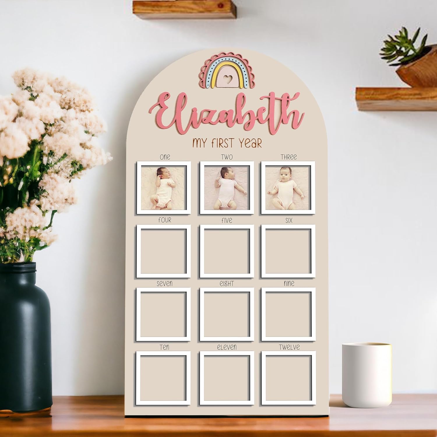 My First Year Photo Frame: Capture your baby’s first year with our babys first year picture frame. This baby first year photo frame helps you record their growth from newborn to one year, showcasing each milestone in a 12 month picture frame for baby first year. The wooden plaque includes space for your baby’s full name, making it a personalized keepsake. Our 12 month pictures for baby first year, my first year photo board, one year photo board is a wonderful way to celebrate these moments.
