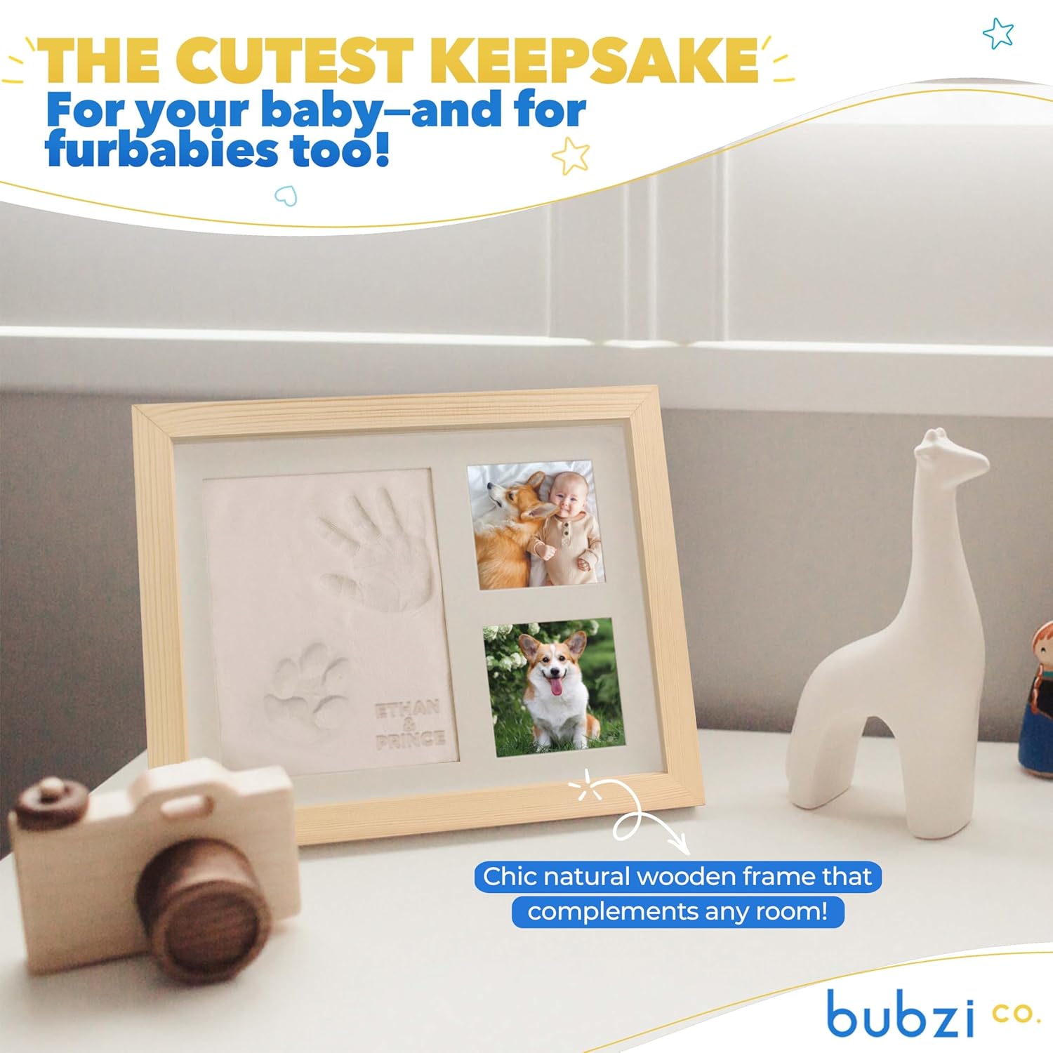EASY TO USE FOR BABY AND PETS The Bubzi co baby keepsake frame is designed with you in mind. Even with the tiniest, wiggliest, fingers and toes, you can flawlessly capture your newborn’s handprint, footprint ( or even paw print ). Simply press their tiny hand or foot into the soft, air-drying clay to capture a precious imprint you will cherish forever!