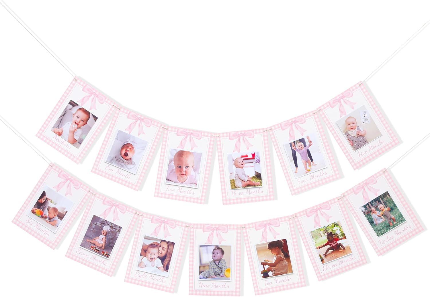 MILESTONE BOW BANNER: This 12-month bow photo banner will make parties shine brighter and can be used for indoor and outdoor parties. You can hang it anywhere you want and add sophistication to your home