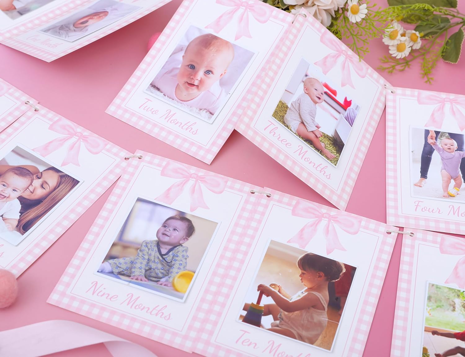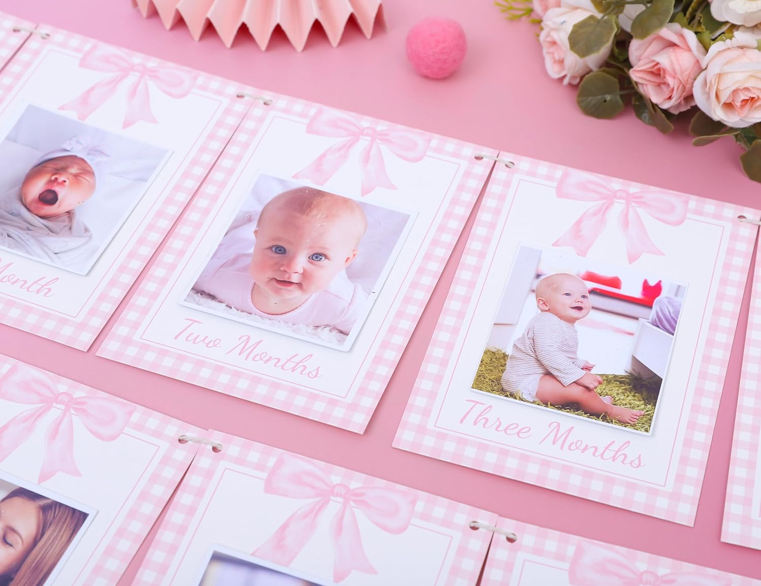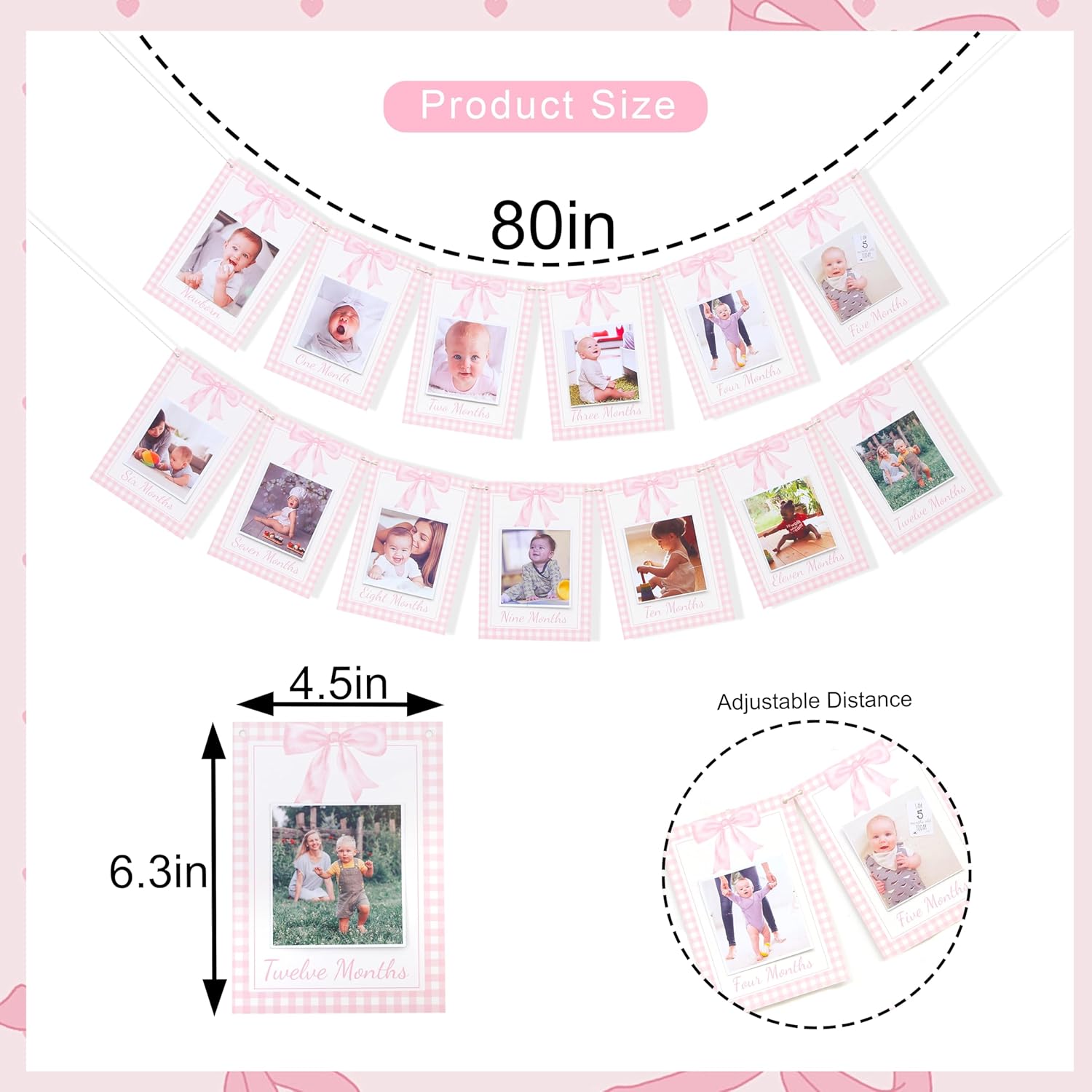 First Year Monthly Photo Banner,12 Month Bow Photo Banner, Pink Gingham Frame Design, 80-inch Baby Milestone Picture Display