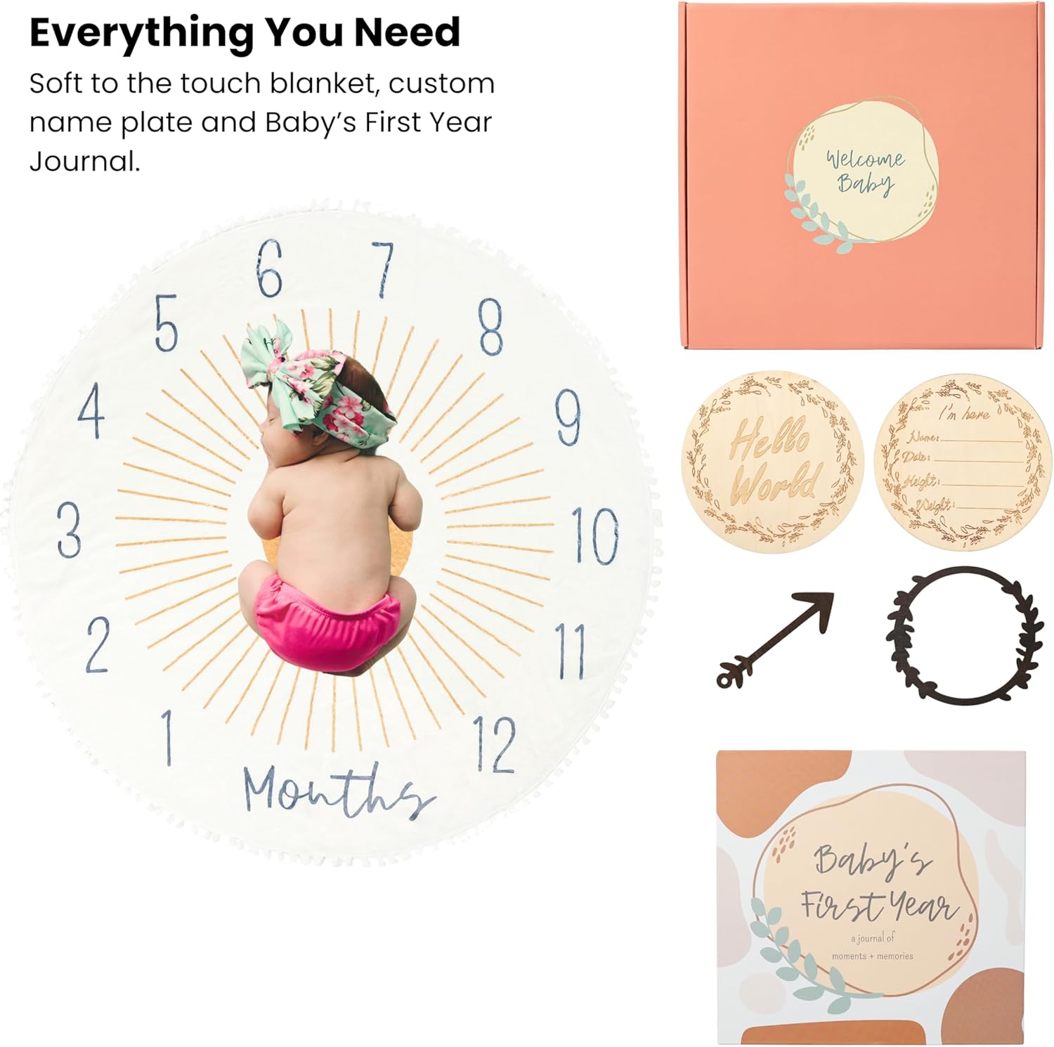 - 🧸 Milestone Blanket – Soft fleece with boho tassels for cozy cuddles and monthly photo shoots.