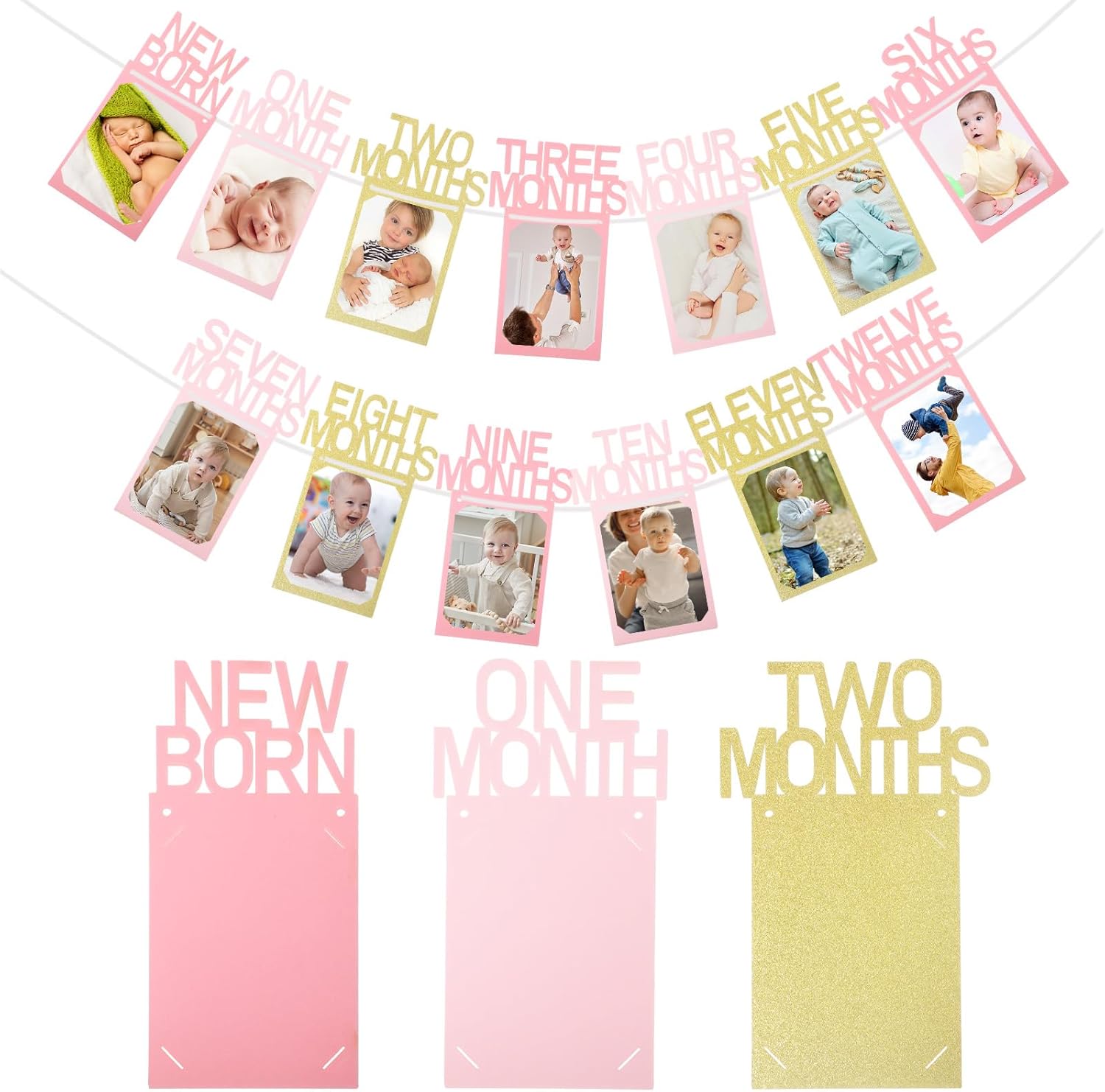 Sweet One Birthday Party Decorations: the kit of first photo banner includes 13 photo frame cards from newborn to 12 months, 1 white ribbon and 1 plastic needle; The cards include glitter gold color, light pink color and pink color, which are sure to capture attention, making it ideal for girl monthly milestones garland