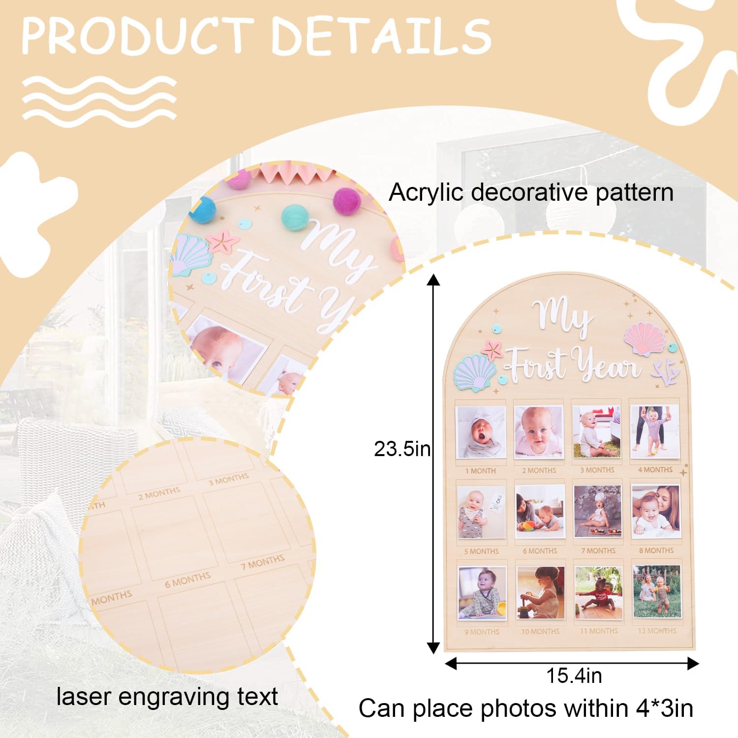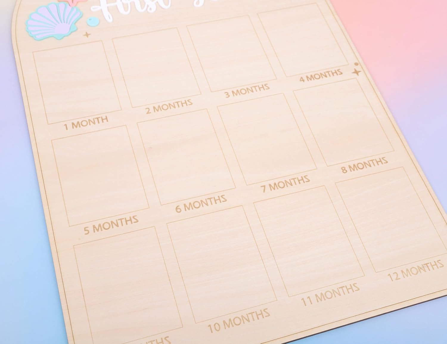 The surface of the wooden mermaid photo display board for 1 to 12 months is smooth and easy to paste. You can paste the cute monthly photos in the corresponding box, which is not easily damaged or deformed and can be used for a long timep>