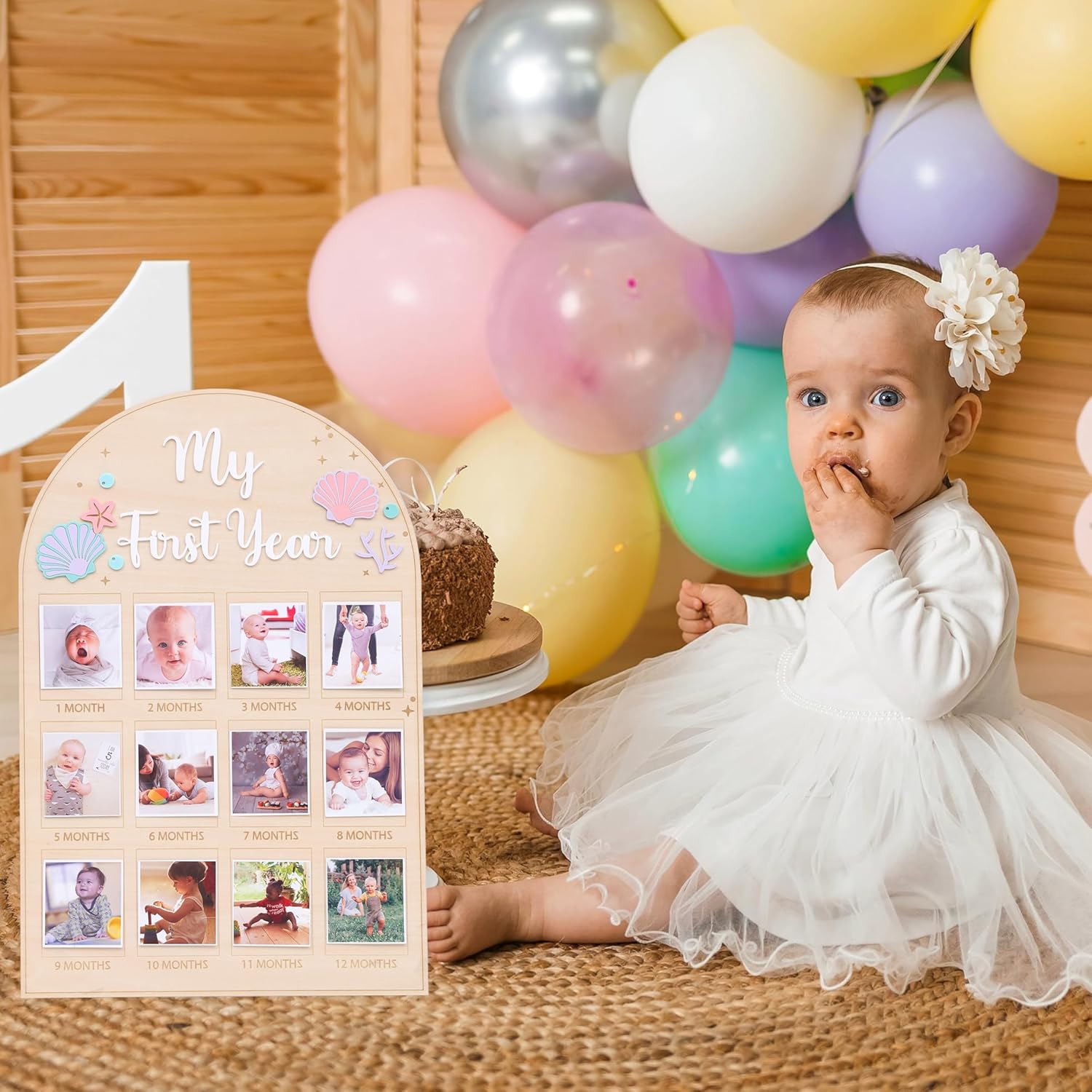 OCEAN THEMED MILESTONE BOARD: Installing my first year photo board is easy, just put the monthly photos on the corresponding frame as an ocean photo prop, especially suitable for parents who want to easily record their cute first year