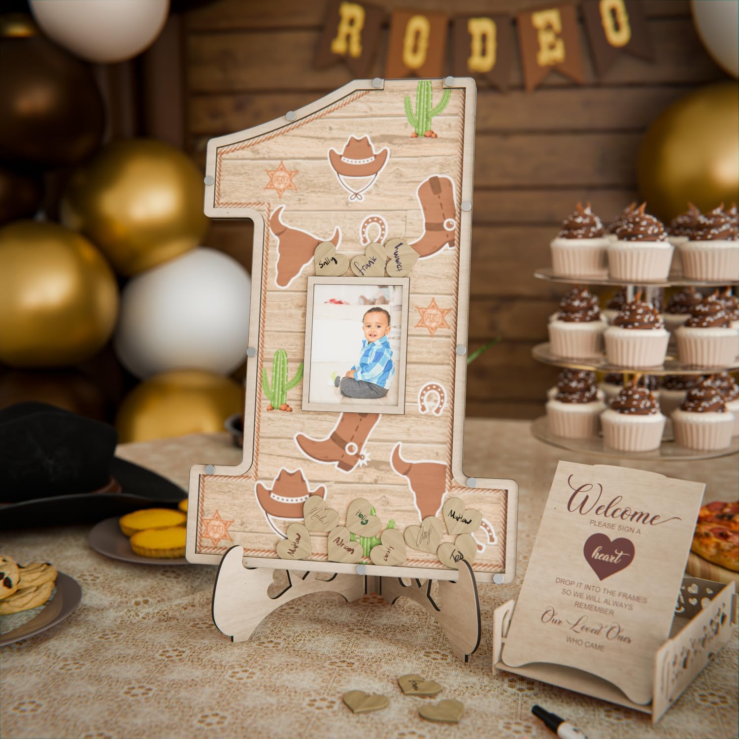 My First Rodeo Decorations Cowboy Keepsake Memories: Wrangle up lasting memories with our rodeo-themed number one-shaped frame, perfect for your little buckaroo’s 1st rodeo birthday decorations. Guests can sign and drop heart-shaped notes around the adorable photo, giving a Western twist to the traditional guest book.