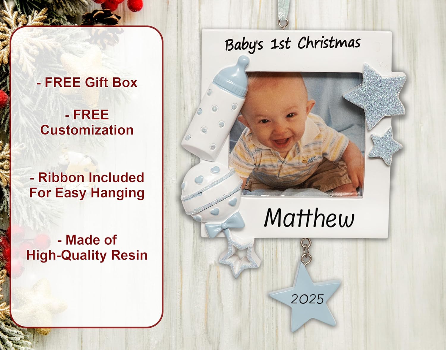 Personalized Baby’s First Christmas Ornament 2025 | Custom Blue Baby Boy Picture Frame Christmas Tree Ornament | My 1st Xmas Gift for Newborn New Grandbaby