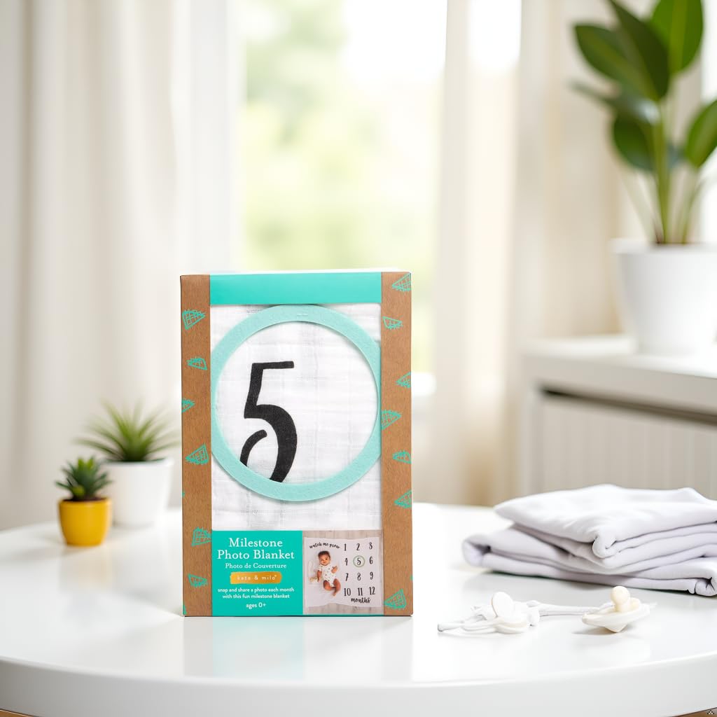Kate & Milo’s Baby Milestone Blanket makes a wonderful photo sharing prop for creating beautiful photos of baby girl or baby boy’s milestones to send to friends and family. This newborn keepsake is the perfect new baby gift for new and expecting moms and dads! Our 100% muslin cotton newborn monthly milestone blanket has space for your baby under the words “watch me grow” and features the numbers 1 months through 12 months so you can show your baby’s age and growth in each photo. It also comes with a cut-out felt disc photo prop so you can circle the corresponding number for each photo. The color scheme is neutral with a white background and black writing. Get creative with your tiny infant’s outfits and dress up accessories you plan their monthly milestone blanket photo shoot. We’re sure the baby pictures they come up with will be memorable and adorable – and the family memories they create while putting the whole thing together will be just as great as their keepsake photos! A perfect baby registry gift to bring to your next baby shower, the baby milestone blanket is a unique and fun way to make sure that every single baby highlight gets recorded. We know mom, dad and baby will all be thanking you! Dimensions: 40” W x 36” H