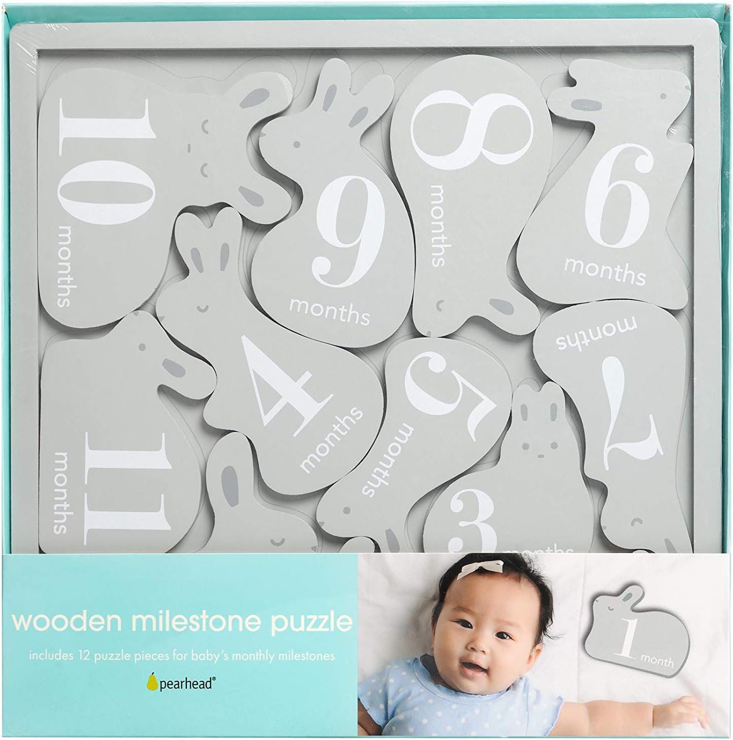 Pearhead’s wooden bunny monthly milestone photo props are an adorable way to capture your little one’s growth through baby’s first year! Mark each month of baby’s growth and create keepsakes that you will be sure to cherish for years to come. The gray bunny pieces are gender-neutral, making this board great for both baby girls and baby boys. The keepsake milestone markers include a wooden, gray board with outline for each pieces placement and 12 wooden bunny shaped photo prop discs labeled “1 month” to “1 year.” The neutral color of the bunny will fit perfectly into any photo, next to any outfit choice. Simply capture a picture of baby nect to his or her corresponding monthly age and share the results with friends and family on social media! Once baby is 1 year old you will have the perfect photos to create a collage and look back on every step of baby’s first year. The gender-neutral baby monthly milestone markers board is the perfect gift for any new parent of expecting parent; add this to your very own baby shower gift registry today! At Pearhead, we aim to create genuine, quality products to celebrate your special moments in life. We are a family of designers, marketers, and trendsetters bringing products to life that will bring a smile to your face. From concept and design to production and customer service, the Pearhead team works together seamlessly every step of the way. Whether your baby is celebrating their first year of life, you are announcing your pregnancy, or your pup is celebrating his first holiday season, Pearhead is here to share your moments in style. Board Dimensions: 11.875″ W x 1.875″H x 0.375″ D; pieces vary in size.