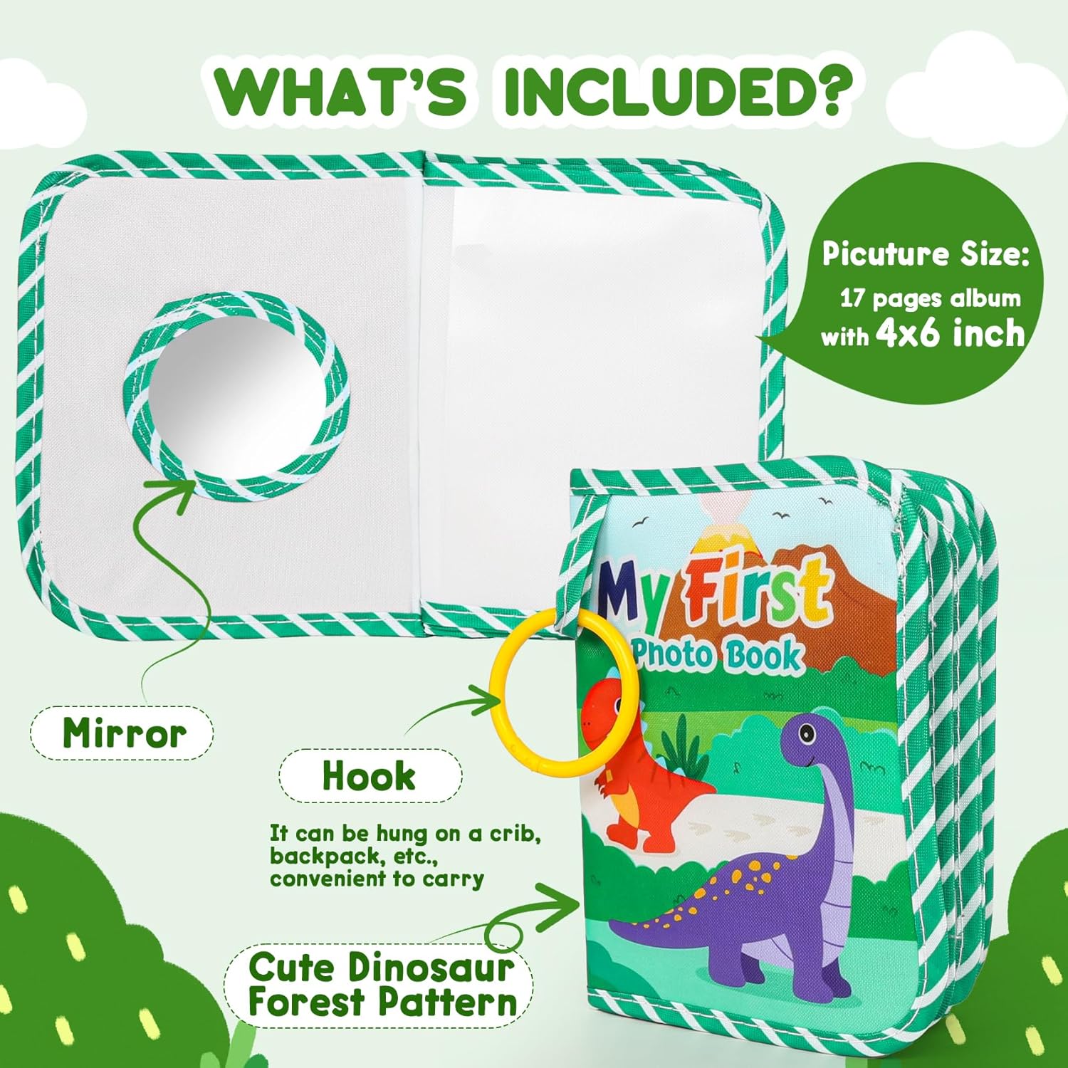 My First Photo Album for Baby: This soft photo album for baby is crafted to cradle precious moments, lightweight and developmentally friendly, printed with cute dinos and equipped with a mirror, which greatly attracts babies to explore themselves.