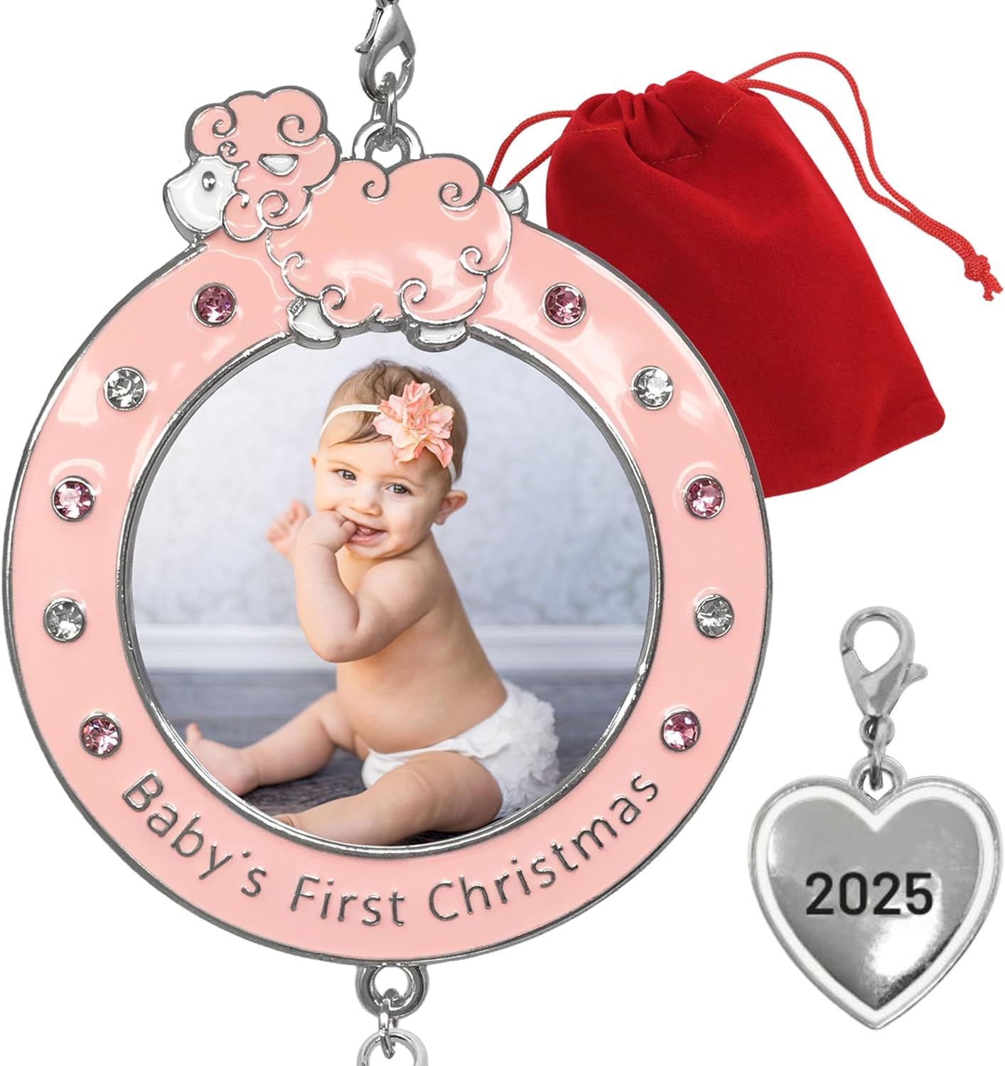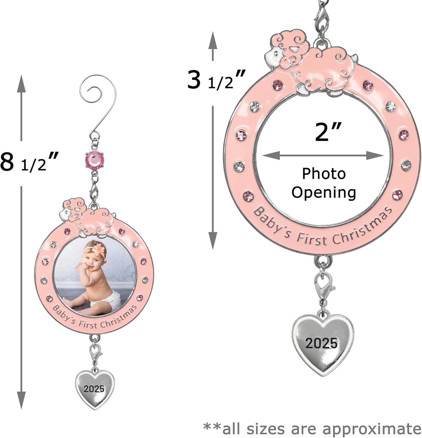Baby girl photo keepsake Christmas ornament 2025 is 3″dia. Beautiful pewter and pink enameled photo ornament with pink and white rhinestones. Baby’s First Christmas along the bottom of the frame. Dated 2025 charm hanging below with hanging height of 8.5″.