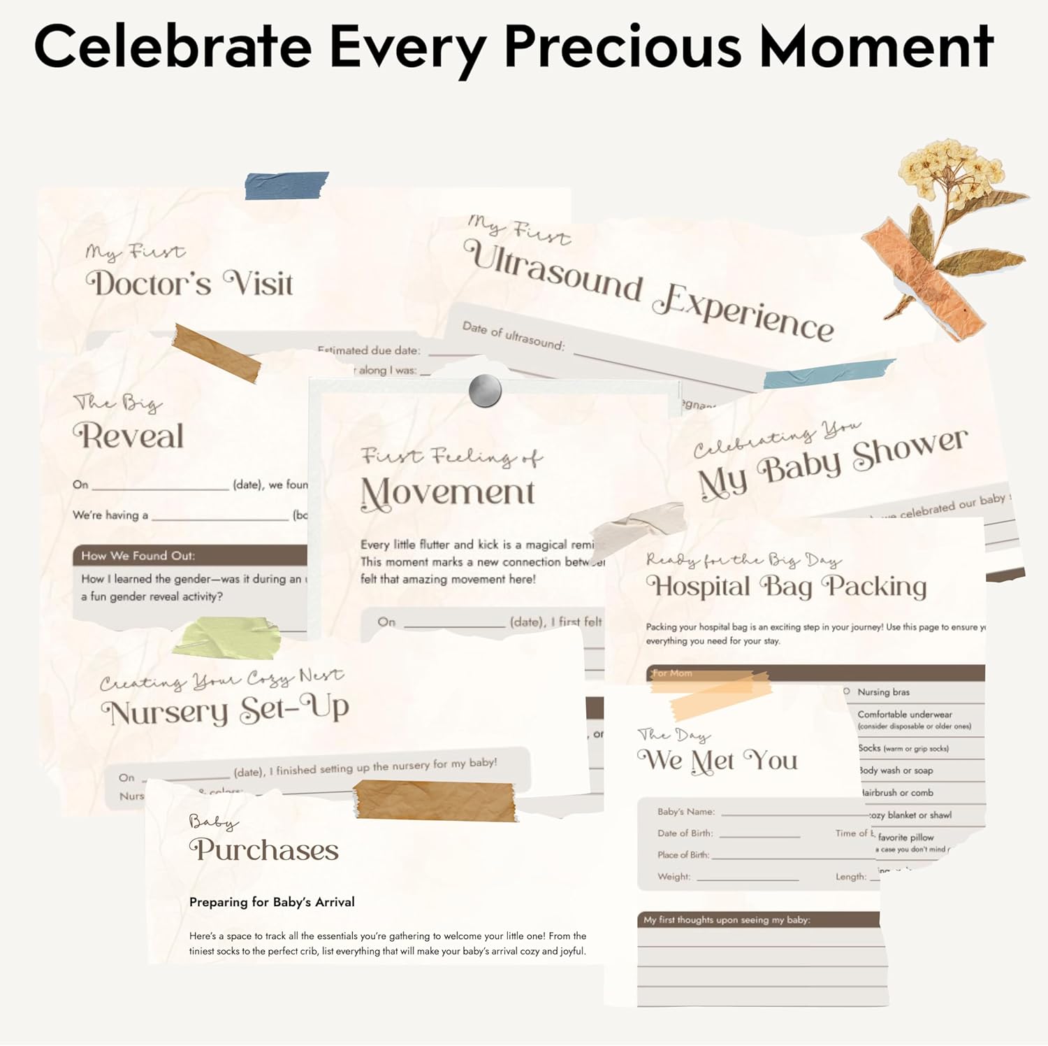 All-in-One Pregnancy Organizer: Covers key milestones like first ultrasound experience, gender reveal, first movement, baby shower, checklist of baby purchases, nursery setup, hospital bag packing, and the day we met you.