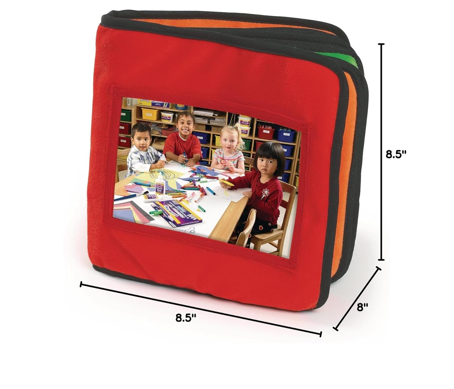 Bright, plush fabric album is perfect for classrooms to show daily activities or field trips or as personal keepsake for family photos. (Young babies respond to photographs of familiar objects and people; using family pictures helps children deal with separation anxiety; machine washable, drip dry; measures 8-1/2 inch L x 8 inch H and fits 4 inch x 6 inch pictures) – discount school supply item # CALBUM.
