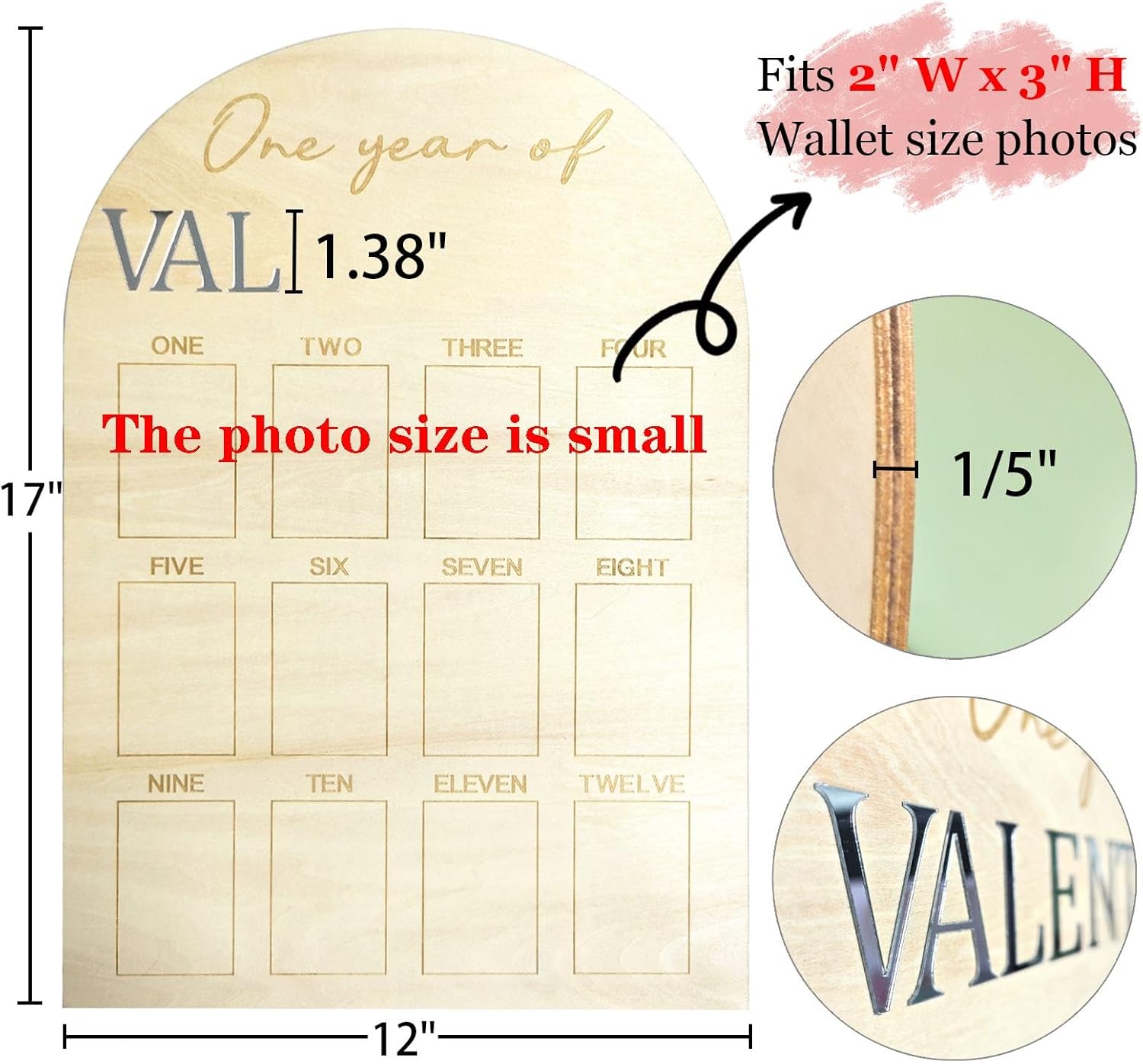 SIZE AND MATERIAL – My first year milestone board size 17″ high x 12″ wide, made from 1/5″ thick premium wood,smooth and reusable, not easy to fade or peel.fits 2″ x 3″ photos (Mini Wallet Size), easy to use.