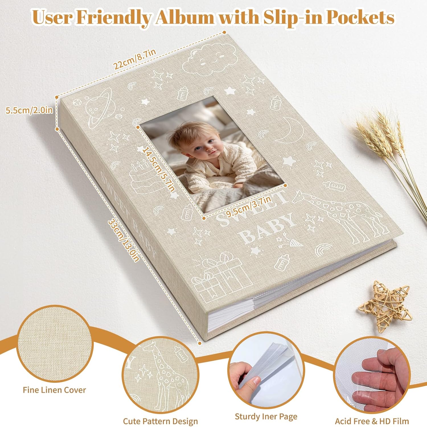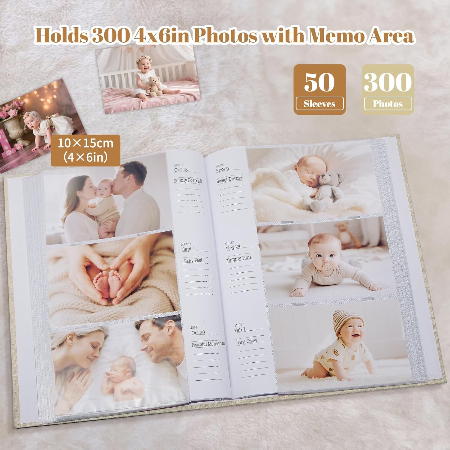Baby Photo Album 4×6 300 Pockets with Memo Area & Hand and Footprint Kit, Linen Cover Slip-in Memory Book with Front Window, Acid-Free Keepsake for Newborn Boy Girl, First Year Moments