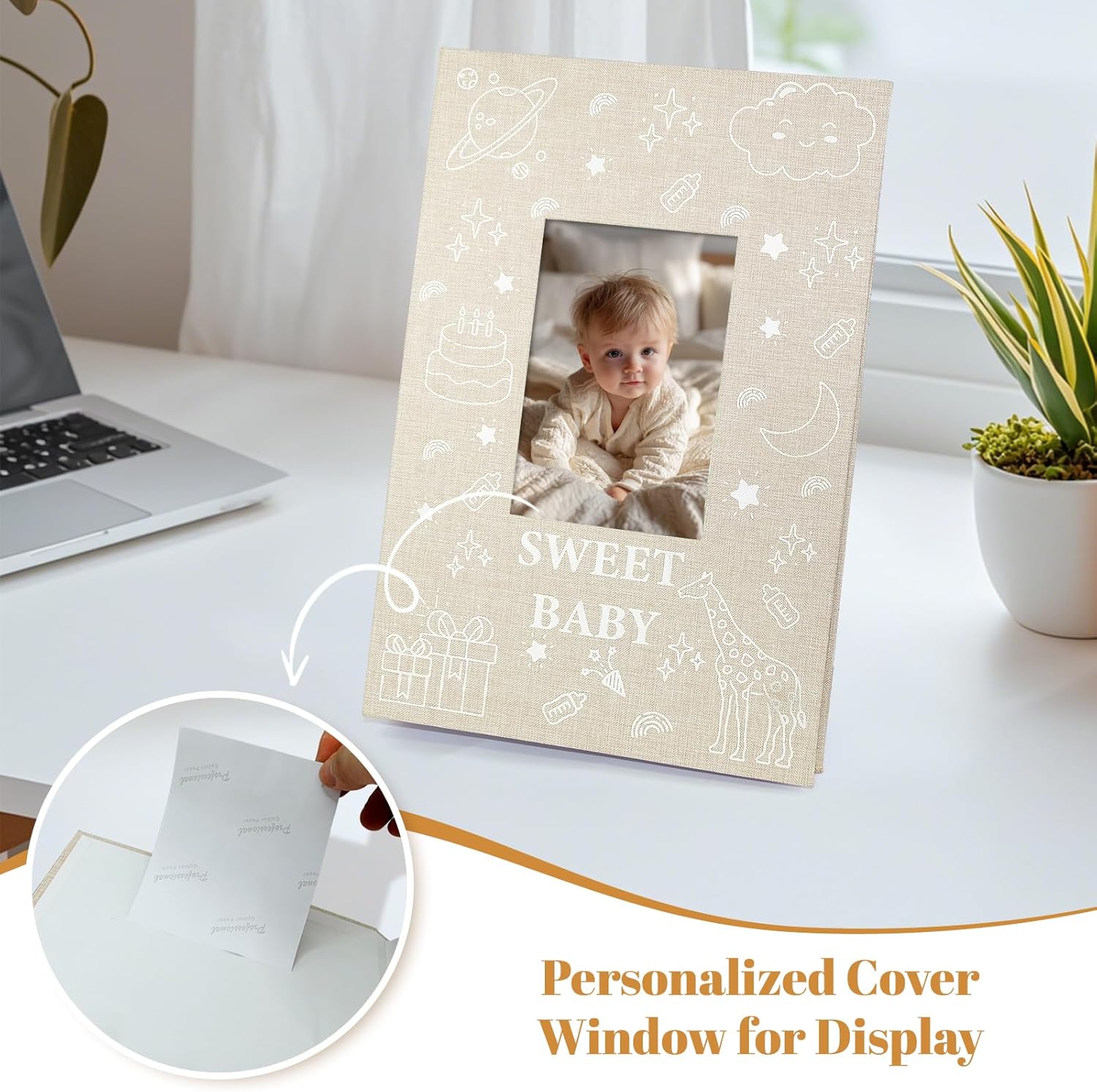 Sweet Linen Cover with Adorable Baby Motifs: Crafted with a soft linen-textured hardcover and adorned with playful white icons like stars, cakes, giraffes, and clouds. The front window allows you to personalize the album with your favorite photo.