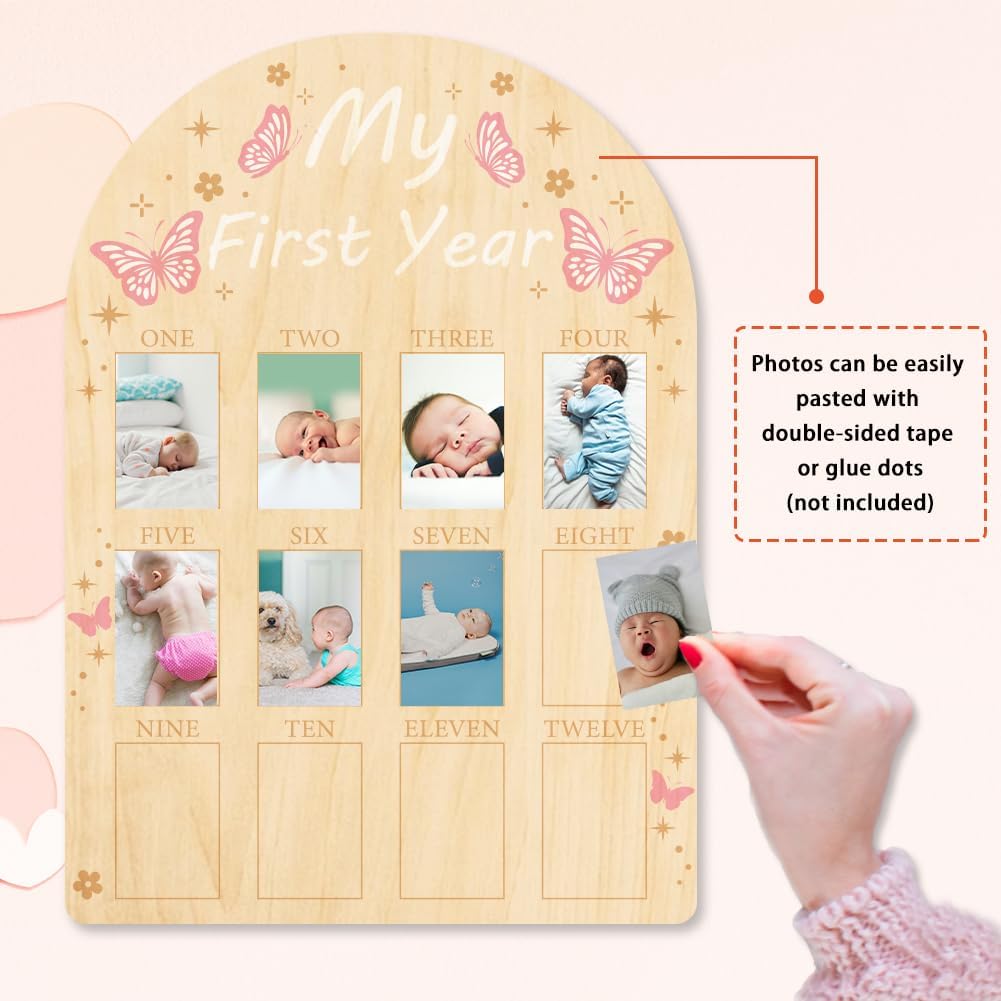 ORIGACH My First Year Baby Growth Photo Display Wood Board – 12 Months Newborn Milestones Picture Frame – Neutral Baby Keepsake Board 1st Birthday Party Nursery Decor New Mom Gift – Pink Butterfly