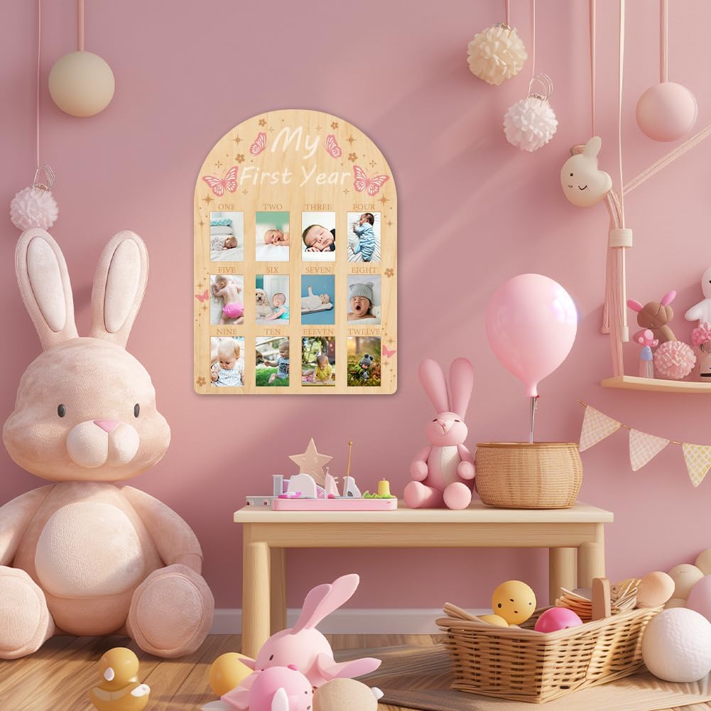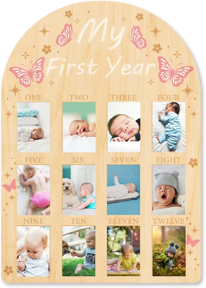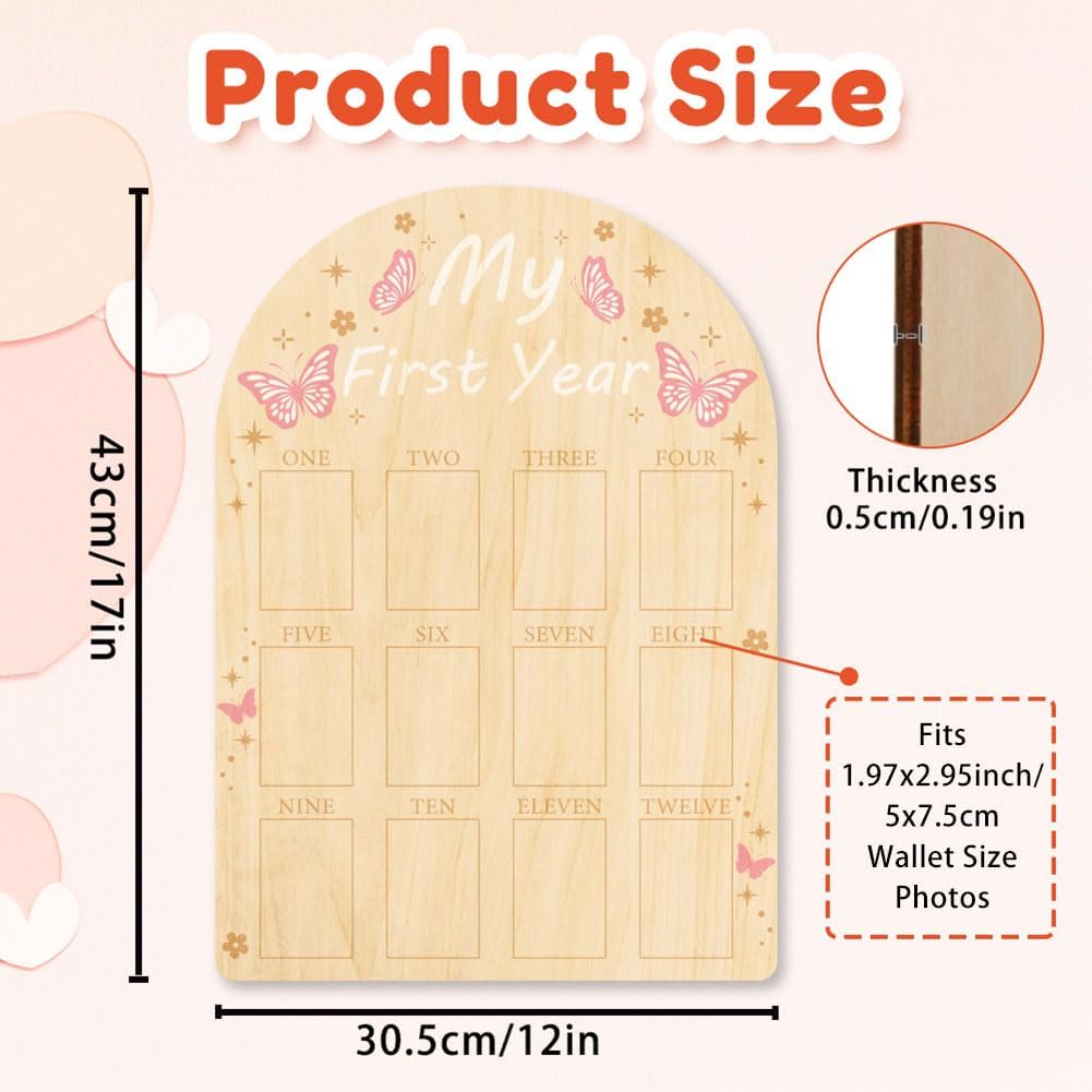 Creative and Pink Butterfly Design: The wooden frame background is decorated with multiple fluttering pink butterflies, stars, flowers and other patterns composed of gentle, lovely and life-like background colours, expressing the parents’ good wishes for their baby. Each photo space is labelled with a number corresponding to each month of the baby’s first year, making it easy to record and review the baby’s growth each month.