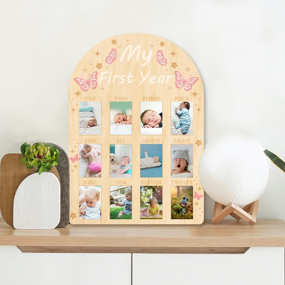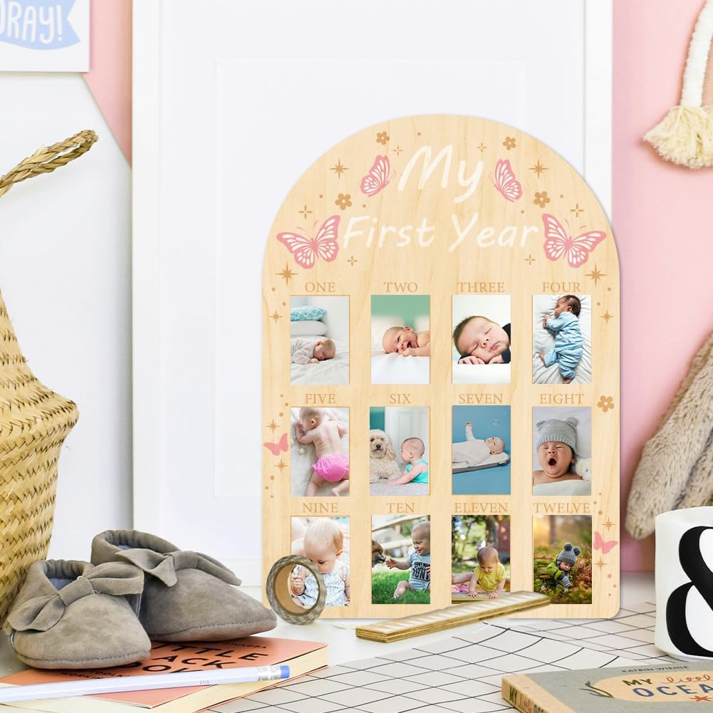 Creative and Pink Butterfly Design: The wooden frame background is decorated with multiple fluttering pink butterflies, stars, flowers and other patterns composed of gentle, lovely and life-like background colours, expressing the parents’ good wishes for their baby. Each photo space is labelled with a number corresponding to each month of the baby’s first year, making it easy to record and review the baby’s growth each month.